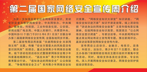 我院网络安全宣传周活动的主要内容有三个方面。一是通过在校园网主站开设醒目的大幅窗口,直接链接第二届国家网络安全宣传周官网,广泛宣传和学习党和国家网络安全战略、方针、政策。做到让大家能及时、全程了解和学习国家网络安全宣传周官网上的政策和知识,了解目前国家在网络安全方面的前沿动态。二是针对部分同志对网上信息关注度不高等情况,通过板报介绍和宣传第二届国家网络安全宣传周安排和主要内容,使大家对第二届国家网络安全宣传周有一个基本了解。三是通过在学院行政楼前等的大型电子屏幕上播放本次网络宣传周主题“共建网络安全,共享网络文明”,使广大教职员工更加关注网络安全,共同构建文明、安全的网络环境。