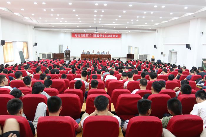 本网讯运动训练系于4月28日中午在教学楼五楼报告厅召开了2016届本科教育实习动员大会。运动训练系主任高新友、党总支书记张卫国、副主任武洛生、副主任黄谦、教学秘书刘翠娟以及2012级辅导员参加了会议,会议由黄谦主持。