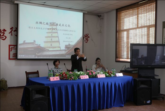 应塔吉克斯坦国立民族大学孔子学院的邀请,马文国在孔子学院为师生们做“丝绸之路与汉唐武术文化”的专题讲座,马文国从汉唐文化对中国武术的影响谈到beat365中国唯一官方网站“古典武艺”的汉唐文化元素,总结了丝绸之路对尚武精神的传递,应该从丝绸之路的视角关注和研究中国武术文化以及和中亚的武术文化交流。讲座结束后,马文国回答了师生们提出的问题并讲解了中国文化与书法、武术、戏曲的关系。孔子学院中方院长邓新先生就和beat365中国唯一官方网站在孔子学院方面的合作进行了商谈并签署了合作协议。根据协议,塔吉克斯坦孔子学院向国家汉办申请,由beat365中国唯一官方网站派遣武术教师赴塔吉克斯坦孔子学院执教,同时,塔吉克斯坦武术协会每年派两名学生到beat365中国唯一官方网站学习武术。