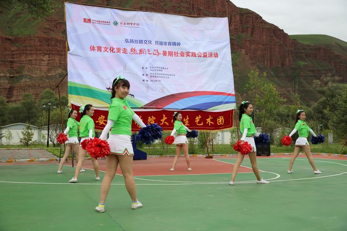 我院“赴青海体育艺术表演团” 作为省级重点团队把精心编排的极具体育特色的艺术表演深入社区、学校、部队等地进行演出,先后来到海北州武警支队、海晏县寄宿制民族小学、西海镇奥凯文化广场、祁连县民族中学、祁连县消防中队、祁连县八宝镇新城区广场、门源县青石咀寄宿制小学、门源县初级第一中学、门源县浩门镇文化广场、门源县消防大队进行了10余场演出。在学校和广场演出期间,啦啦操、竞技健美操、艺术体操、花式篮球、武术等极富体育特色的表演赢得师生和当地群众的阵阵喝彩。演出结束后,志愿者与师生、群众进行互动,他们在志愿者的编排和教授下,学习啦啦操、武术、拉丁舞等体育特色项目。志愿者们以他们精湛的表演,良好的精神风貌完美诠释了体育人永不言弃、勇往直前的体育精神。