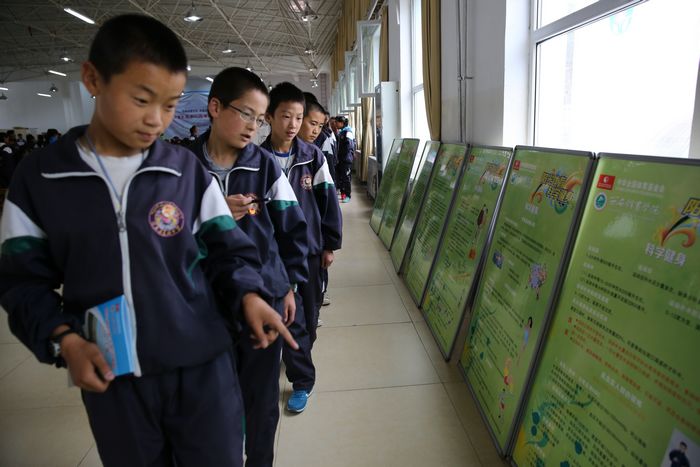 祁连县民族中学的学生观看全民健身知识展板