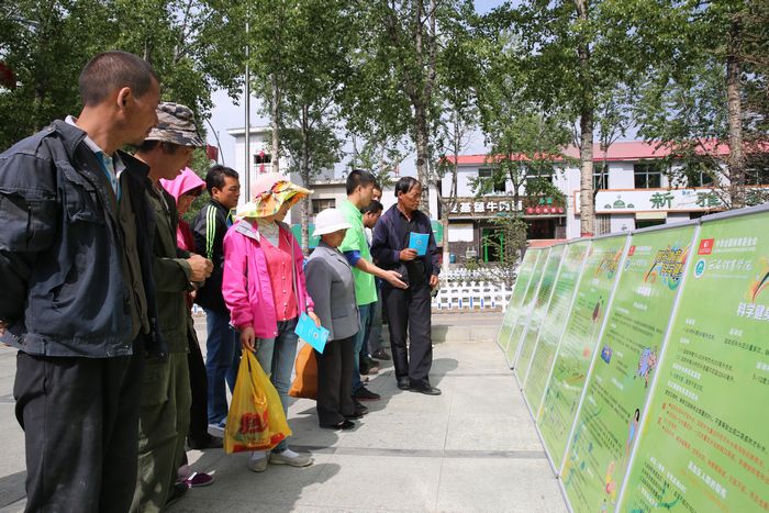 海晏县的百姓观看全民健身知识展板