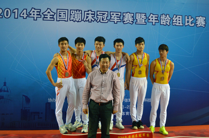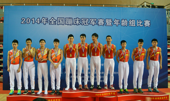 本网讯 5月16至18日,2014年全国蹦床冠军赛在天津举办,这是新全运周期首个全国性蹦床赛事,来自全国14支代表队160余名运动员将角逐10枚金牌。我院参赛运动员喜获三项冠军:张世豪、张文愿获得男子网上同步冠军;胡佳媛、吴泽莹获得女子网上同步冠军;宁文龙与上海队合作获得团体冠军。同时女子网上团体张沛阳、胡佳媛、吴泽莹获得第五名,男子单跳、团体贺小玉、尹辰获得第七名。