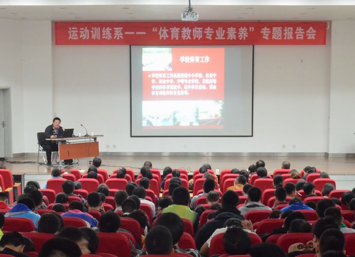 本网讯近日,运动训练系邀请国家级骨干教师、陕西省特级教师、西北工业大学附属中学体音美教研组组长屈中乾在教学楼五楼报告厅为该系2012级学生作了一场题为“如何做一名合格的体育教师”的专题报告。报告会由运动训练系副主任武洛生主持,