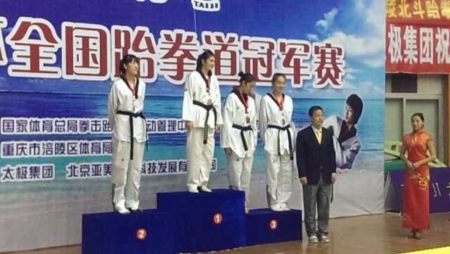 本网讯11月8—11日,2013年全国“太极杯”跆拳道冠军赛在重庆举行,全国各省市38支代表队237名运动员参加了角逐,我院跆拳道队塔拉、李东华、薛燕红、孟文龙夺得一金两铜和一个第五名的优异成绩,这也是我院运动员近年来在国内高水平跆拳道比赛中获得的最好成绩。