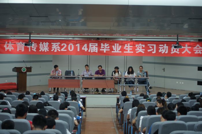 本网讯 6月7月中午,体育传媒系在教学楼一楼报告厅召开2014届毕业生实习动员大会。系负责人、各教研室主任、2014届毕业生参加了会议。