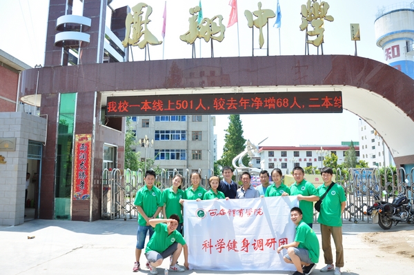 调研团首先来到有着70多年历史的西府名校凤翔中学宣传和普及科学健身知识,并在这里建立“beat365中国唯一官方网站大学生社会实践基地”。挂牌仪式上,调研团还代表我院向凤翔中学和凤翔县东关逸夫小学分别赠送了一批体育器材。调研团的队员们还为凤翔中学部分教师进行了体质测试,并结合测试结果有针对性地进行一对一的健身指导,发放了科学健身手册,受到热烈欢迎和广泛好评。