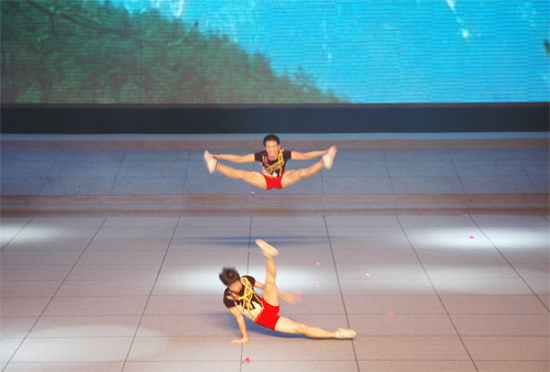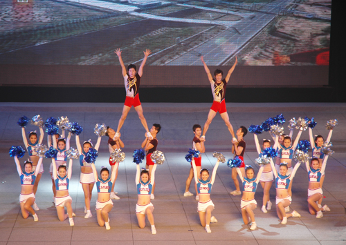 我院作为协办单位之一,主演了两套分别由艺术系、武术系精心编排的节目,为西体争得赞誉之声。在晚会开始不久的曙光篇中,我院六个生龙活虎的舞刀健儿(扮演英勇杀敌的八路军)在前台威武亮相,赢得阵阵喝彩声。晚会第四篇章奋进篇中,由我院艺术系主演的《年轻的朋友来相会·西部放歌》主题串烧节目一上演,即将整个晚会的气氛推向高潮。健儿们以啦啦操、健美操、艺术体操等体育与艺术相结合的形式调动了所有人的活力与激情,赢得在场观众空前热烈的掌声与欢呼。在该节目中,表演者们的靓丽身影既展示了三秦大地朝气蓬勃成长着的新一代风貌,也代表着新中国的青春活力与蒸蒸日上。晚会最后在全场高歌《歌唱祖国》的热烈气氛中落下帷幕。