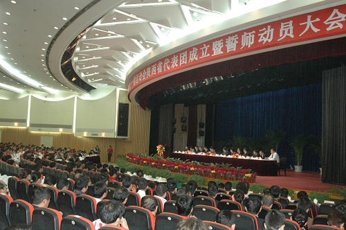 9月9日上午,全国第十一届运动会陕西省代表团成立暨誓师大会在西安国际会议中心隆重举行。我院院长苏明理,党委副书记苏义民,副院长权德庆、雷新声、周里等领导同志应邀出席了会议。陕西省副省长郑小明代表省委省政府向十一运会陕西代表团授旗,省体育局局长李明华代表陕西代表团接旗。郑小明表示,省委省政府将竭尽全力为我省代表团提供支持和保障,希望运动健儿们顽强拼搏,勇创佳绩。运动员代表郭文珺和教练员、训练单位代表张根学分别发言,决心以实际行动向三秦父老交上一份满意答卷。