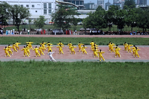 在本次比赛由承办班级六班激情四射活力无限的体育舞蹈表演拉开序幕 。比赛中,各参赛队伍都英姿飒爽,迎着骄阳在宽阔的田径场上尽自己的努力把太极拳表演地如行云流水般,初三路拳打的是铿锵有力,场上的观众都为精彩的表演的参赛班级呐喊助威,整个田径场上都充满了他们的欢呼声,评委老师一丝不苟的评判,激励了同学们的表现欲望。