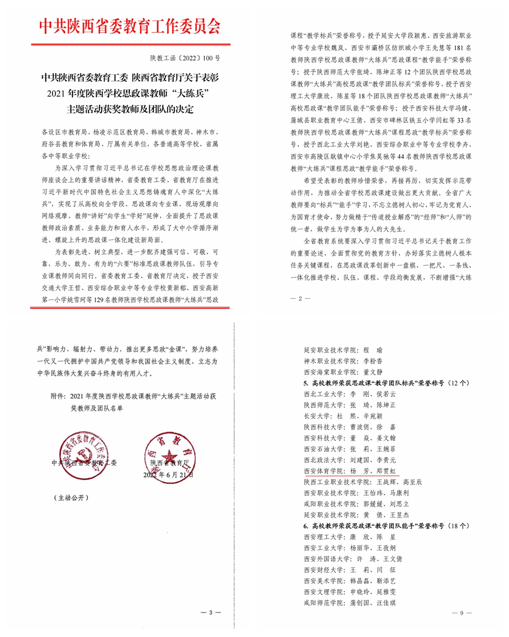 本网讯 日前,陕西省委教育工委、陕西省教育厅发布《关于表彰2021年度陕西学校思政课教师“大练兵”主题活动获奖教师及团队的决定》(陕教工函〔2022〕100号),beat365官网马克思主义学院教师杨芳带领体育新闻与传媒学院学生郑贯虹获得陕西学校思政课教师“大练兵”高校思政课“教学团队标兵”荣誉称号。我省共有包括西北工业大学在内的12所学校的教学团队获此殊荣。