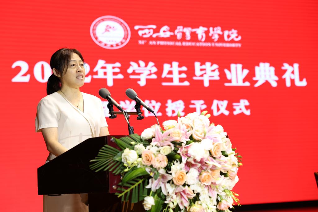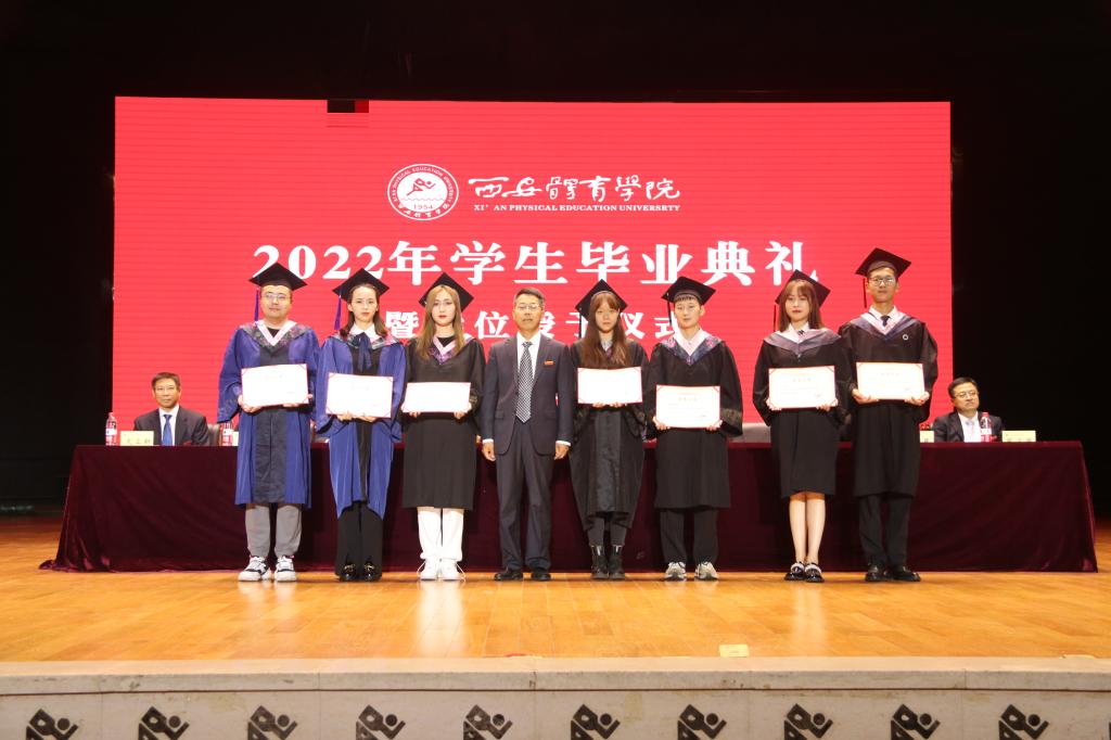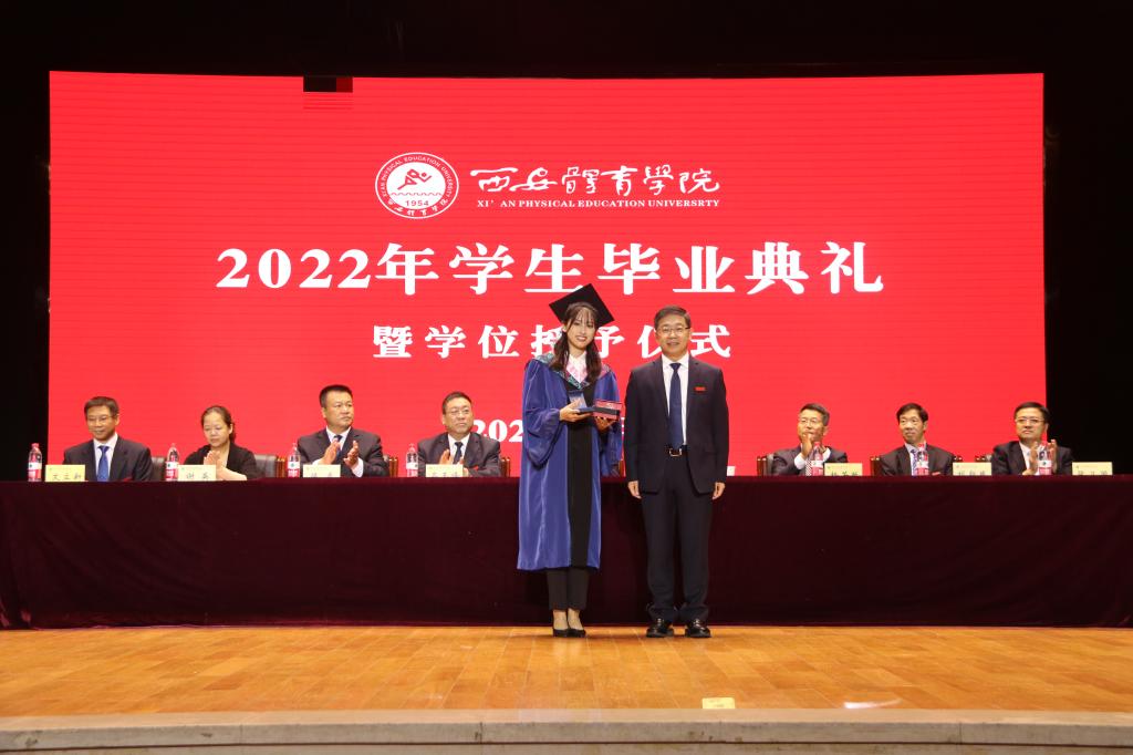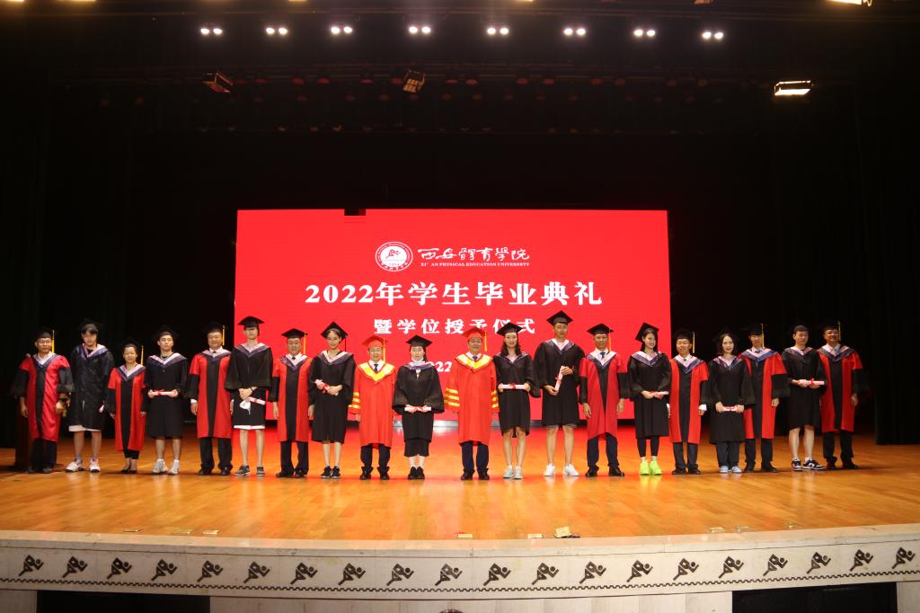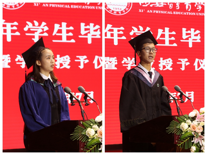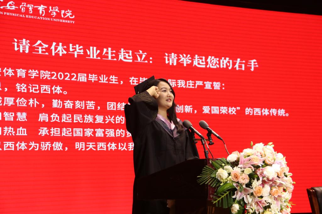 获得省级优秀学生干部荣誉称号的徐豆、薛柯柯分别代表2022届毕业的硕士研究生和本科生发表了毕业致辞,对母校的辛勤培养、老师的谆谆教诲、同窗的相遇相伴表示了感谢。“2019级全体研究生毕业生将牢记‘严谨、创新、团结、拼搏’的校训,始终要胸怀大志、脚踏实地、勇挑重担、不畏艰险、追求卓越。”徐豆代表研究生发出铮铮誓言。“四年青春定格在这里,我们的身上深深烙上了西体的印记。我们将牢记西体校训,传承西体精神,坚守知行合一,内心常怀感恩,以青春之我、奋斗之我,为民族复兴铺路架桥,为祖国建设添砖加瓦!”薛柯柯的发言道出了现场700余名学生的心声。