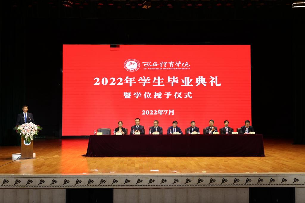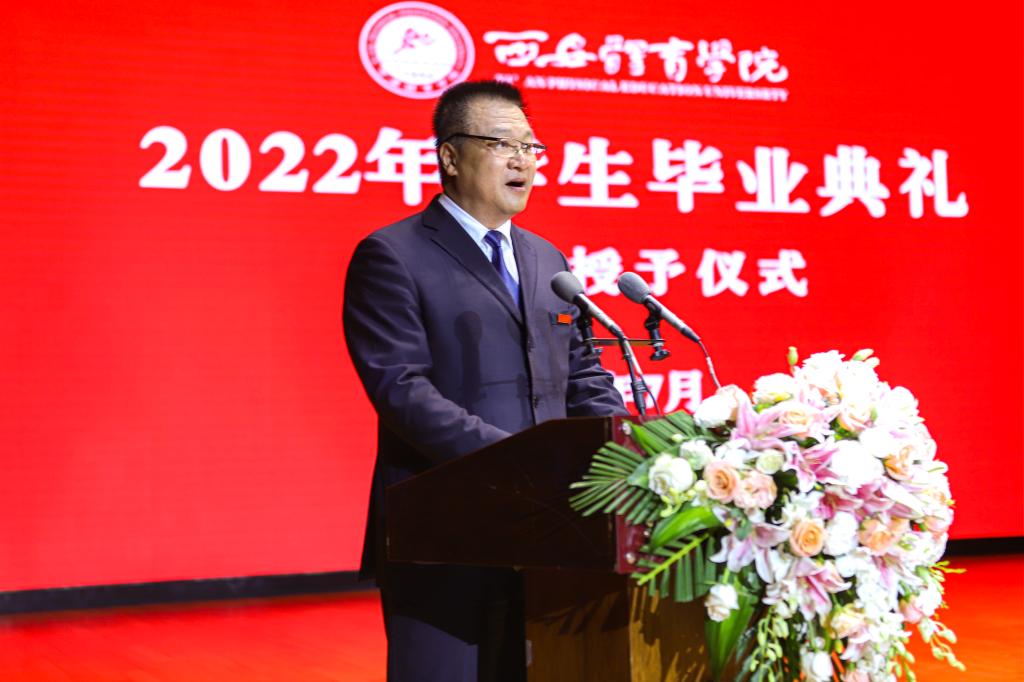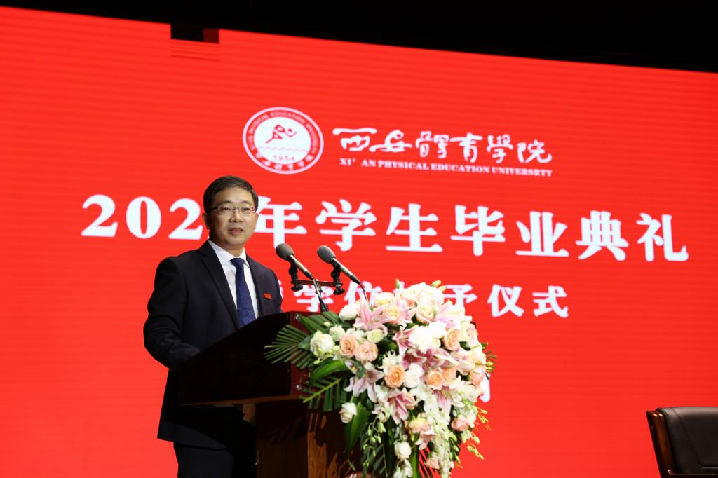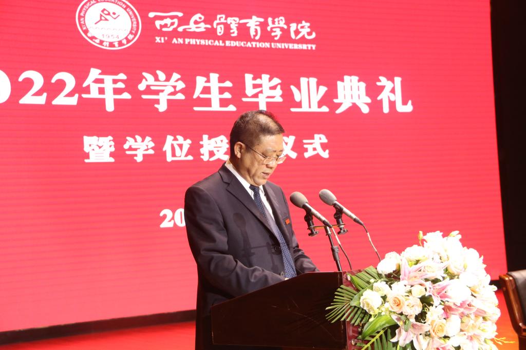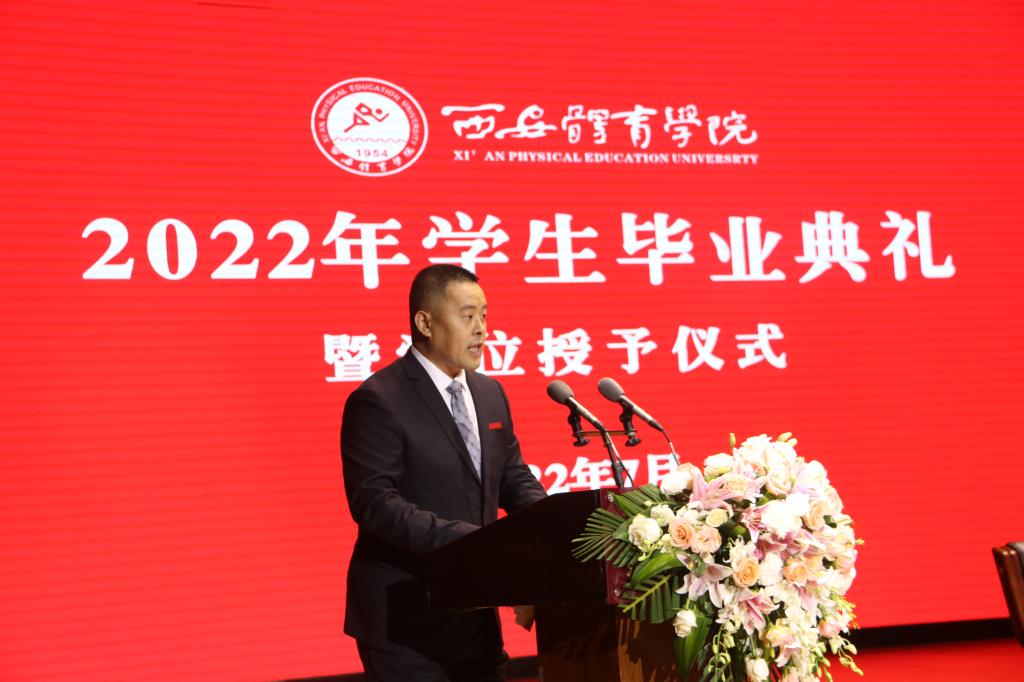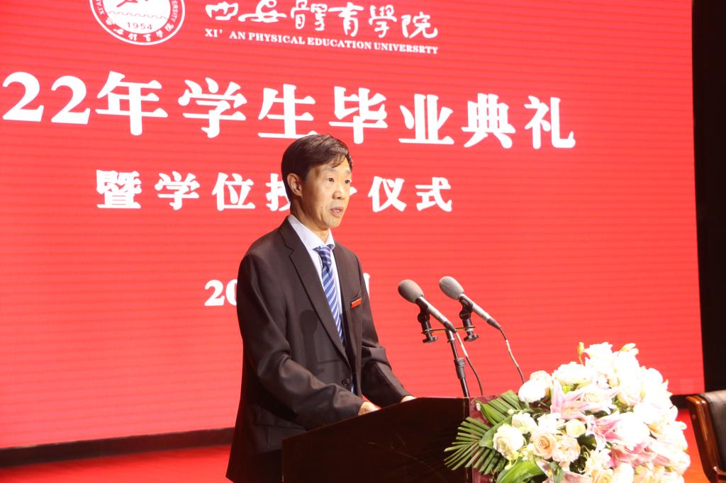 校长刘子实以《做一个堂堂正正、舒展挺拔的体育人》为题,为2040名本科毕业生和318名硕士毕业生送上临别的寄语。“但愿苍生俱饱暖,不辞辛苦出山林”,希望大家做一个胸怀家国的人。把小我融入大我,把个人的青春梦想融入历史向前的滚滚洪流中,唱响“青春之歌”,成为“强国一代”,在新的岗位上充分展示时代新人的志气、骨气、底气,彰显体育英才的勇气、锐气、豪气,在实现中华民族伟大复兴的赛道上跑出加速度、争创新成绩。“问渠那得清如许,为有源头活水来”,希望大家做一个终身学习的人。把学习当成一种工作习惯、一种生活方式,向书本学、向人民学、向身边学、向实践学、向智者学、向国外有益经验学,以终身学习的韧劲,成为所从事工作的行家里手。“自信人生二百年,会当水击三千里”,希望大家做一个自信自强的人。青春无悔,奋斗无价;自强不息,未来无限。在新时代新征程,在体育、教育事业最前沿,在创新创业第一线,在乡村振兴主战场,在服务社会各领域,希望看到西体人矢志报国、顽强拼搏、团结奋进、追求卓越的身影。“千淘万漉虽辛苦,吹尽狂沙始到金”,希望大家做一个永不言败的人。人生的旅途从来不是平坦笔直的,要把直面挫折、战胜困难当作永恒的人生课题,在挫折中积蓄力量,在风雨中克难进取、锐意向上!