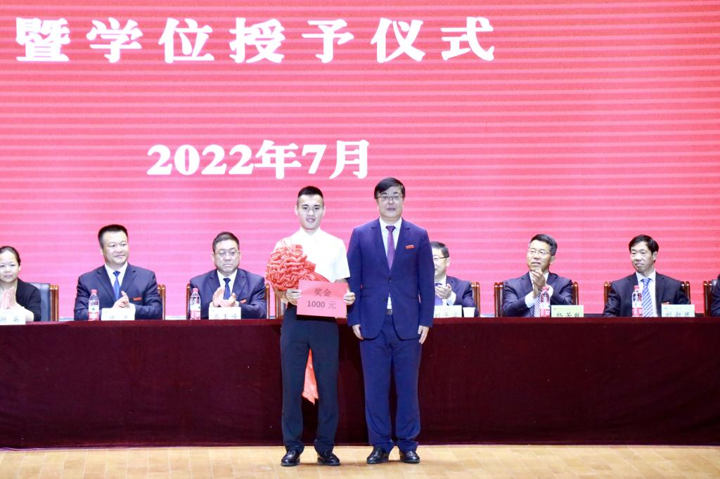 黄道峻为扎根西部支援西藏的2022届毕业生邱宝辉佩戴红花并颁发奖金。刘子实向2022届毕业生代表赠送毕业信物。
