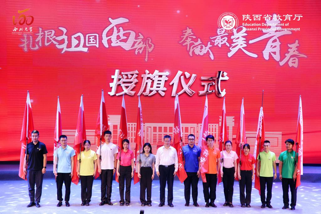 出征仪式上,副省长方光华为2022年到西部基层就业的毕业生代表授旗。beat365官网足球学院2022届毕业生邱宝辉作为奔赴西藏就业的毕业生代表接受了授旗。