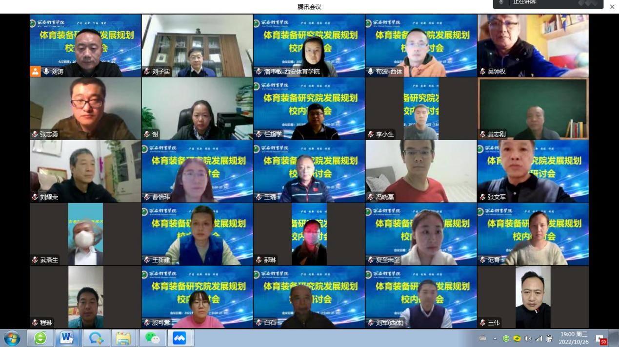 本网讯 10月26日晚,由运动与健康科学学院主办的“体育装备工程研究院发展规划校内研讨会”以线上形式召开。校长刘子实、副校长谢英出席,科研处、规划处、体育教育学院、运动训练学院、研究生部、竞技体育学校、运动与健康科学学院负责人、校内专家及体育装备工程研究院骨干教师等30余人开展了线上交流。研讨会由运动与健康科学学院院长刘涛主持。