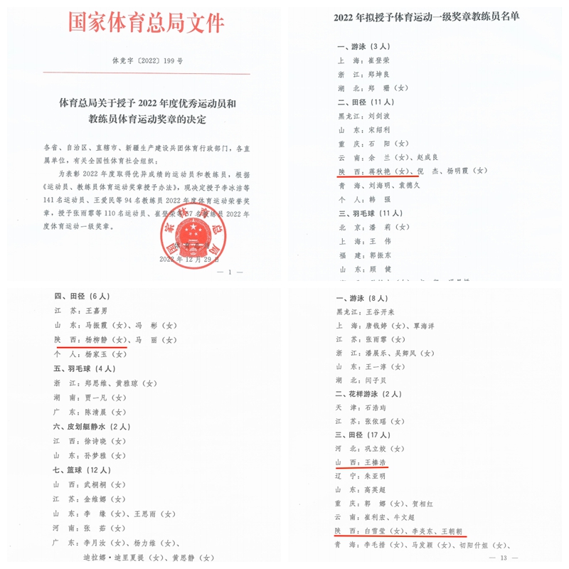 本网讯 为隆重表彰先进典型、激励全国体育系统为建设体育强国而不懈奋斗,近日,国家体育总局发布关于授予2022年度优秀运动员和教练员体育运动荣誉奖章的决定,beat365官网竞走教练员蒋秋艳被授予“2022年度体育运动一级奖章”,中国竞走学校运动员杨柳静被授予“2022年度优秀运动员体育运动荣誉奖章”,王榛浩、李炎东被授予“2022年度体育运动一级奖章”,以表彰他们在2022年国际重大比赛上取得的优异成绩。