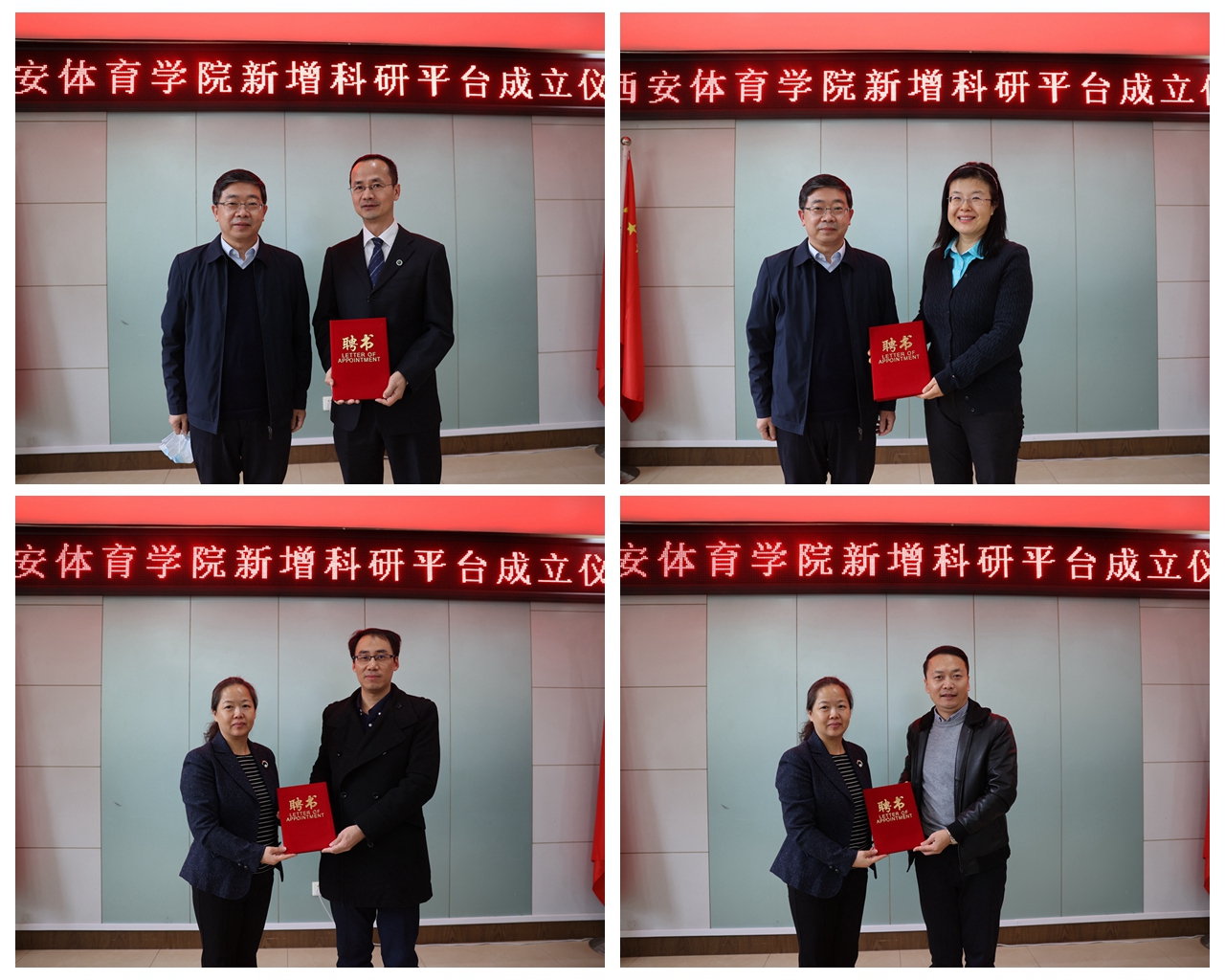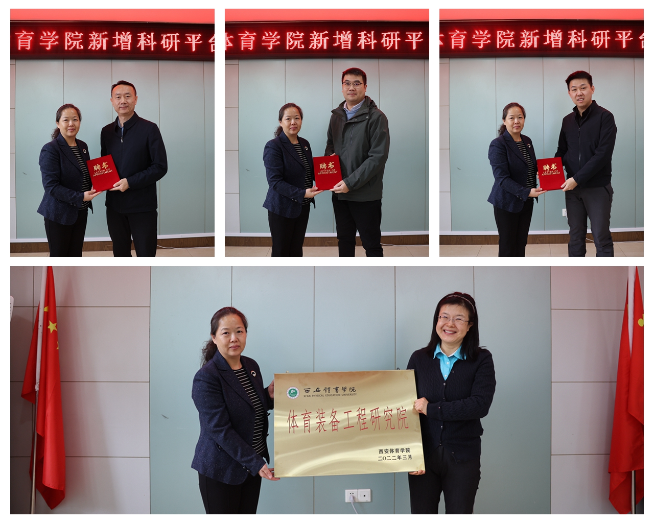 刘子实为苟波颁发“国家体育总局科普基地负责人”聘书,为潘玮敏颁发“陕西省高校工程研究中心主任”和“beat365中国唯一官方网站体育工程装备研究院执行院长”聘书。谢英为陕西省高校工程研究中心技术委员会主任王刚、副主任马海涛、杨少毅、穆鹏远和发展委员会主任刘涛颁发聘书,并为“beat365中国唯一官方网站体育工程装备研究院”揭牌。