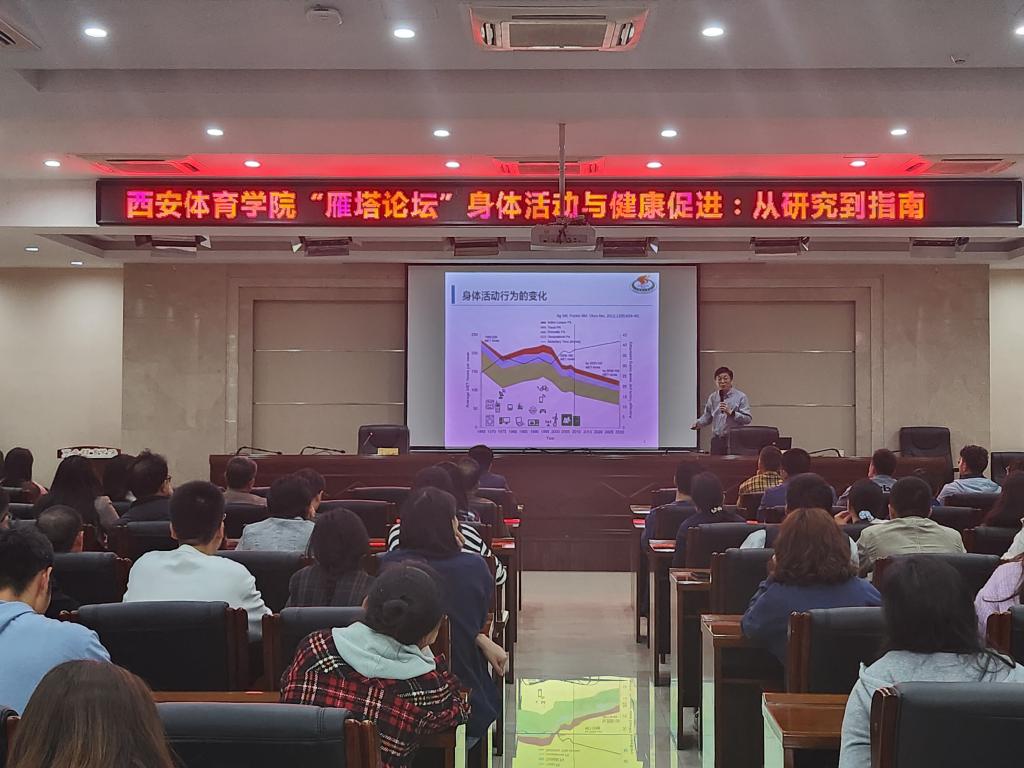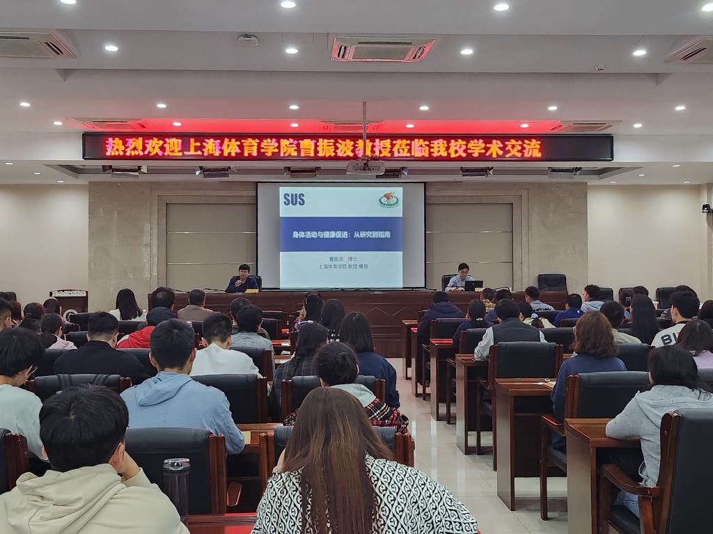 上海体育学院博士生导师、东方学者曹振波教授作了题为《身体活动与健康促进:从研究到指南》的专题学术报告。曹振波教授从身体活动与健康促进研究证据及身体活动指南两个方面阐述了身体活动与健康促进的关系,并详细介绍了健康促进模式由运动模式(EPM)转向日常身体活动模式(LPAM)的转变。结合我国国民身体活动水平现状、健康中国尤其是我国儿童青少年体质健康状况等问题,提出“运动生活化、生活运动化”倡议。互动环节师生就身体活动与健康促进等相关问题与曹振波教授进行了深入的交流,大家纷纷表示曹振波教授的报告层次清晰、逻辑缜密,受益匪浅。