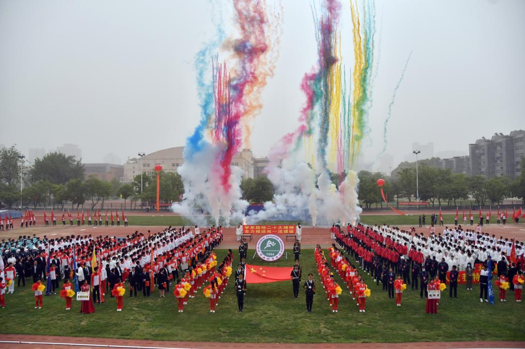 绚丽的礼花腾空而起,绽放在西体上空,全校师生用欢呼声和掌声共庆第47届田径运动会运动会开幕。