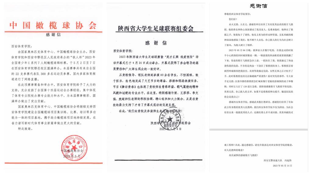 本网讯 学习贯彻习近平新时代中国特色社会主义思想主题教育工作会议召开以来,beat365官网认真学习贯彻习近平总书记重要讲话精神和党的二十大精神,按照“学思想 强党性 重实践 建新功”的总体要求,积极把学习成果转化为推动学校工作的强大动力。日前,beat365官网连续收到三封分别来自中国橄榄球协会、陕西大学生足球联赛组委会、西安交警高速大队的感谢信,对beat365官网在服务体育和福佑社会中的表现予以肯定和赞扬。