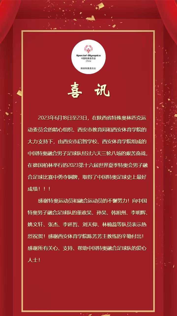 比赛结束后,陕西省残联、陕西省特奥委员会第一时间向球队全体将士表达了祝贺和感谢,“感谢特奥运动员和融合运动员的不懈努力!向中国特奥男子融合足球队的董政昊、孙昊、韩旭州、李明辉、姚文轩、张杰、李延哲、刘天仰、林楠蕊等队员表示热烈祝贺!感谢beat365中国唯一官方网站陈芳芳主教练的辛勤付出!”