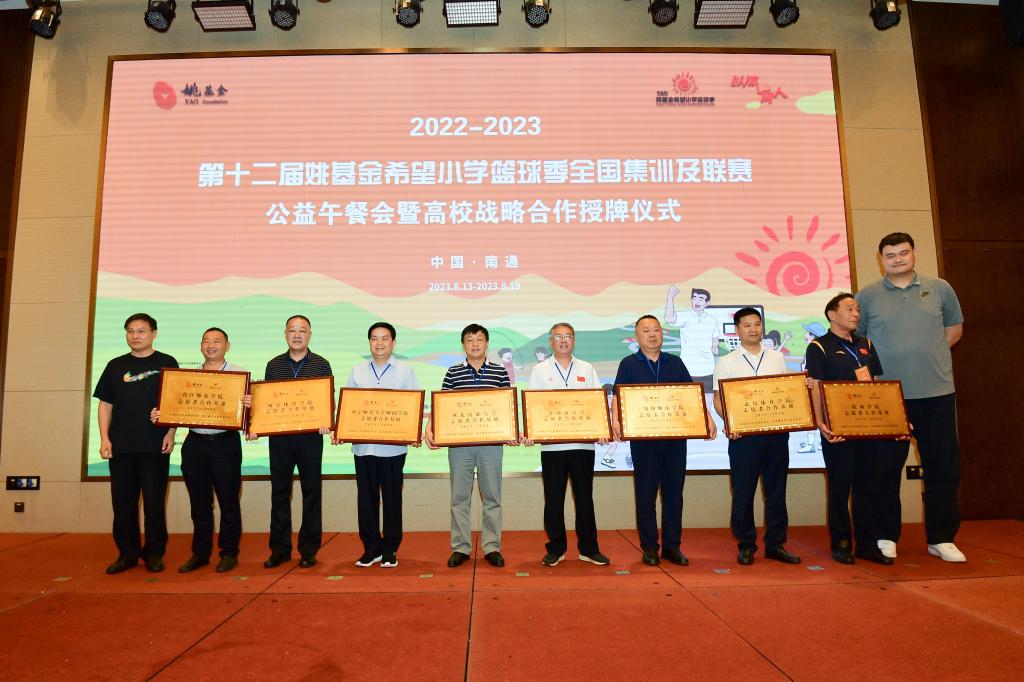 本网讯 2022—2023第十二届姚基金希望小学篮球季全国集训及联赛8月13日—18日在江苏南通举行。校党委委员、党委宣传部部长张朝阳18日出席合作高校战略合作协议授牌仪式,并代表学校接受姚基金创始人、中国篮协主席姚明先生的授牌,全国仅八所高校获此殊荣。这也标志着下一个五年,姚基金将继续与beat365官网合作,共同致力于乡村体育教育,助力乡村振兴。