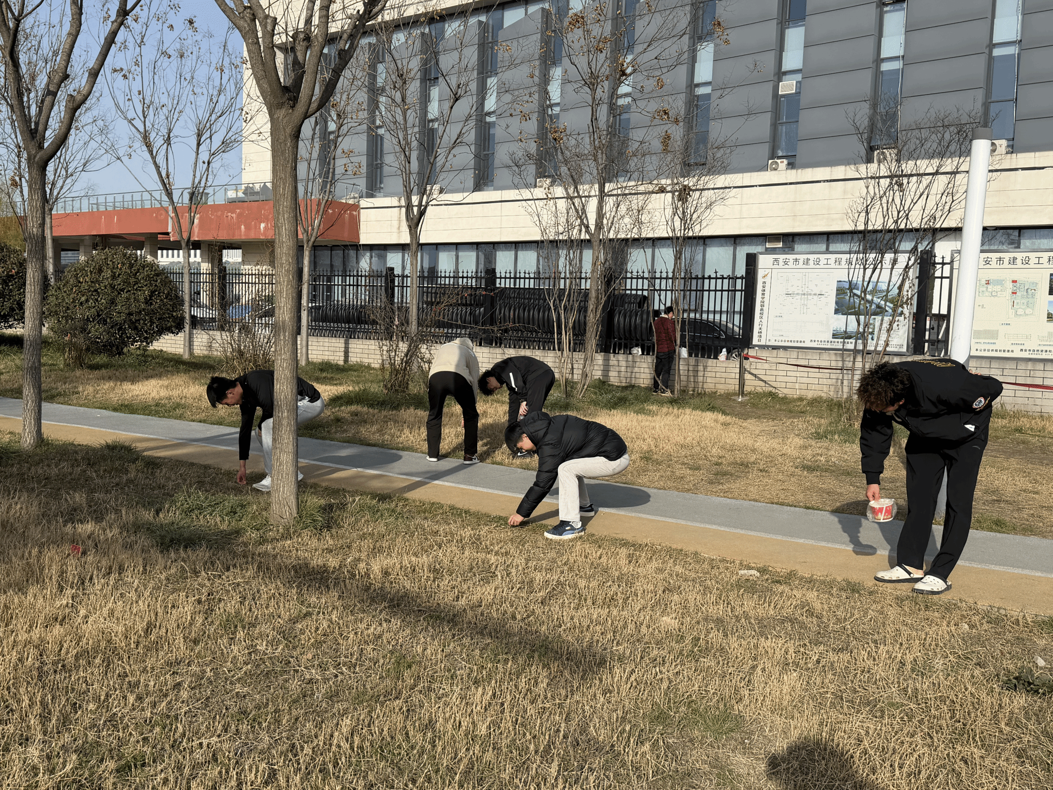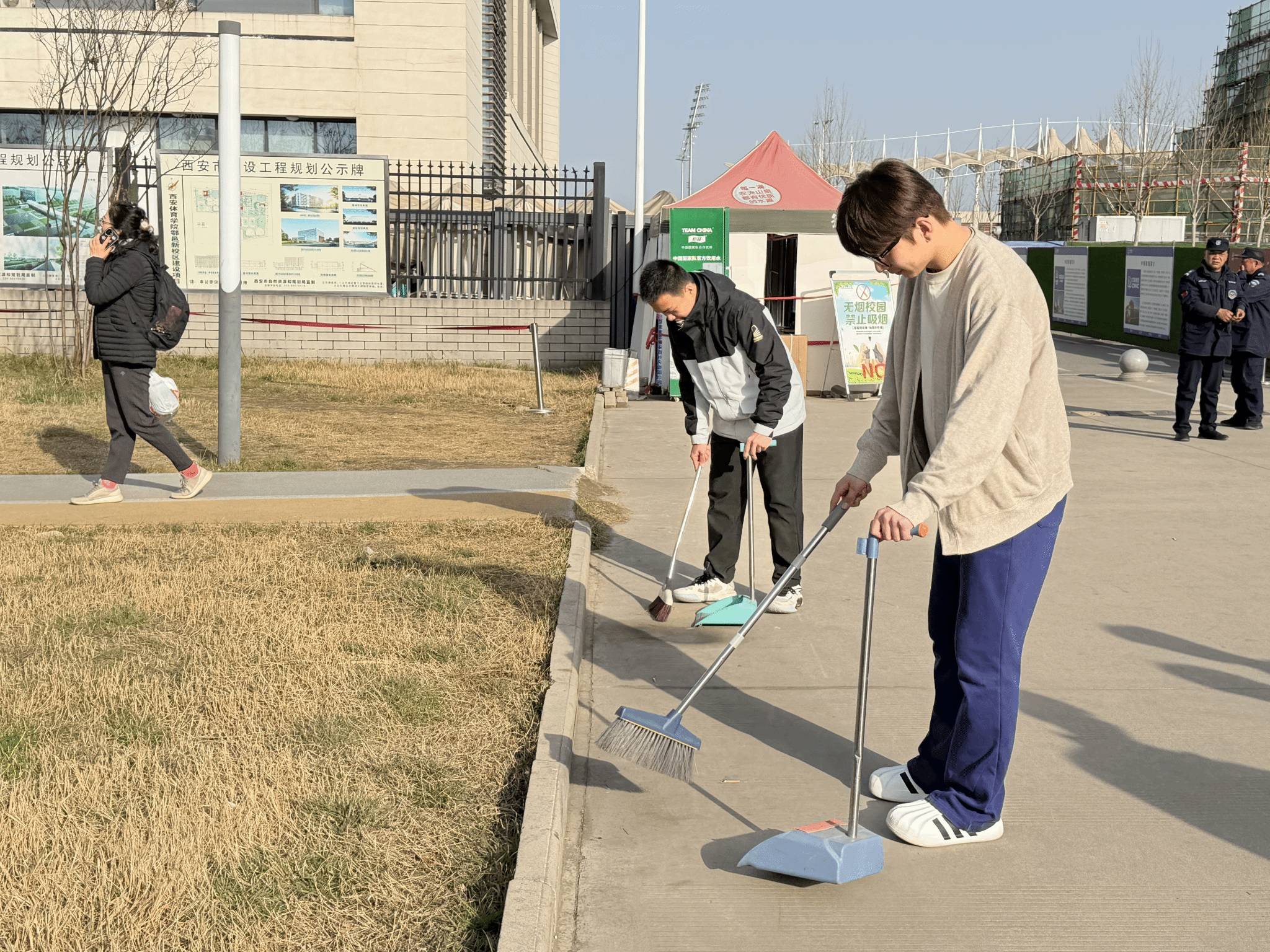 理论学习结束后,践行正式拉开帷幕。董鹏举老师的带领下,全体同学热情高涨地来到学校大门口,开展“学雷锋,见行动”校园环境清洁活动。同学们自带扫帚、簸箕、抹布、垃圾袋等清洁工具,分工协作,干劲十足。有的同学认真清扫校门口的落叶和尘土,有的同学仔细捡拾绿化带中的纸屑和杂物,还有的同学用抹布仔细擦拭校门和宣传栏。大家不怕脏、不怕累,不放过任何一个卫生死角。