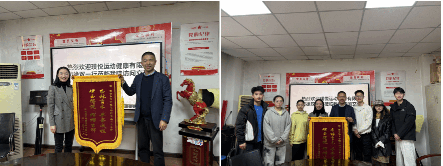 11月13日上午,璞悦运动健康管理(西安)有限公司创始人徐双携5名我院在璞悦工作与实习的学生,专程到访学院,赠送题有“杏林育木、莘莘成栋、璞玉得悦、熠熠生辉”的锦旗,并与学院院长刘军、学工办主任苏菲、党政办主任王言昭和教学秘书熊玲玲开展交流座谈。