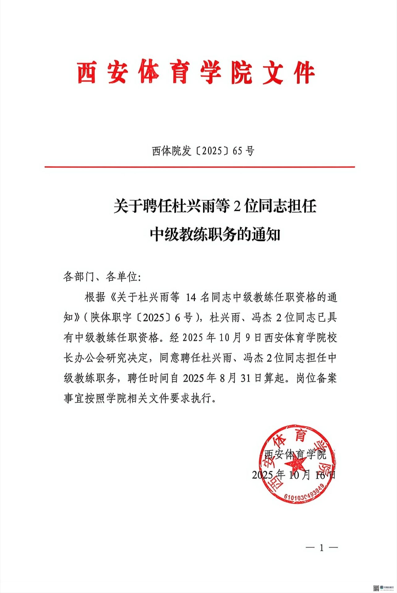 关于聘任杜兴雨等2位同志担任中级教练职务的通知