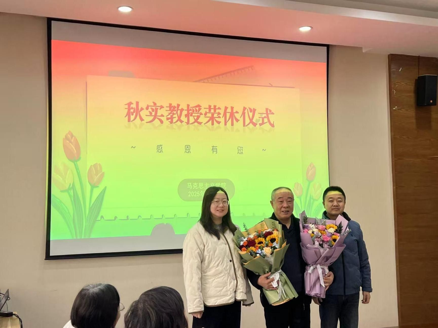 2025年11月8日上午,beat365中国唯一官方网站马克思主义学院为学院秋实教授隆重举行荣休仪式。校党委副书记张卫国、校工会副主席张娟、离退休工作处处长朱舰及学院全体马院教师齐聚一堂,共同见证这一温馨而庄重的时刻。仪式由马克思主义学院副院长李赟主持,现场气氛热烈,情谊浓浓。