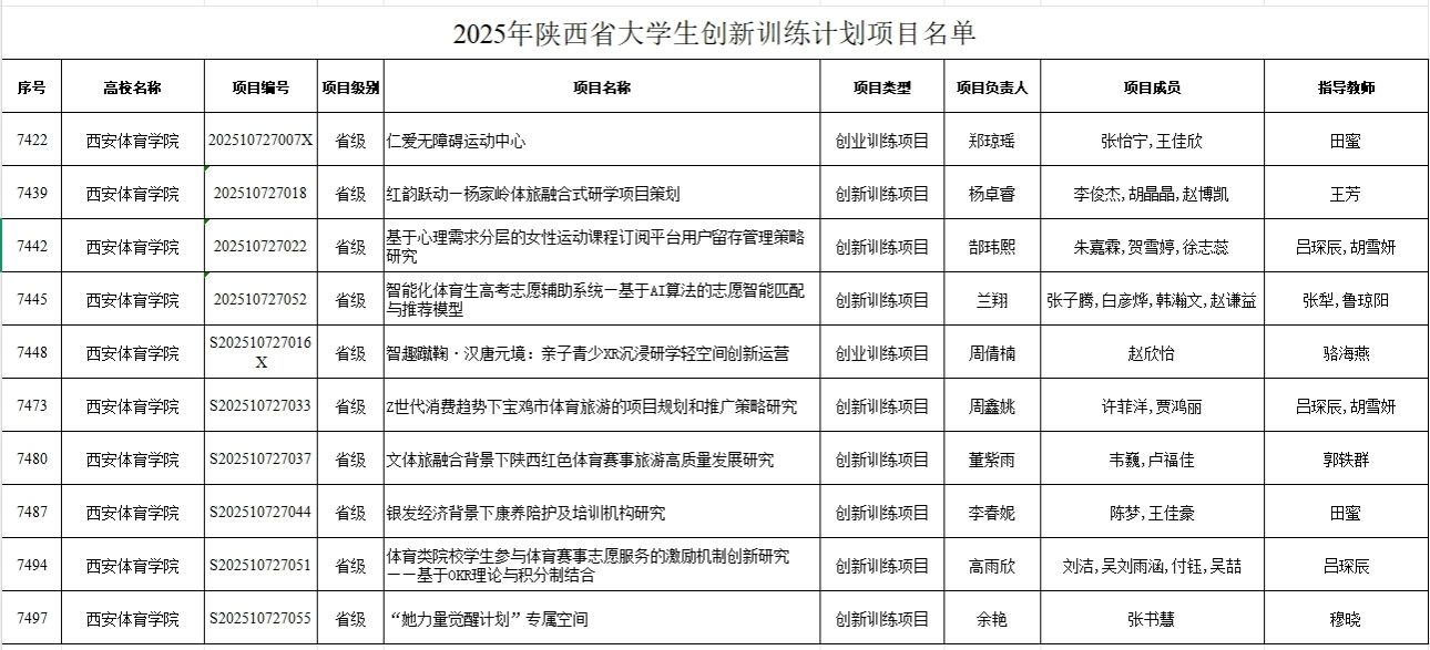 近日,2025年陕西省大学生创新训练计划项目名单正式公布,体育经济与管理学院共有10个项目成功入选省级计划,涵盖创新训练与创业训练两大类型,展现了经管学院学子在体育科技创新、文化传承及产业融合领域的积极探索。