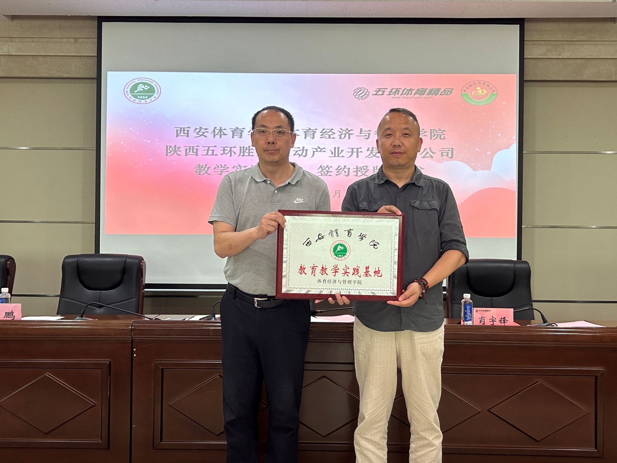 会议第三项,在众人的见证下,体育经济与管理学院与陕西五环胜道运动产业开发有限公司正式签署《教学实践基地共建协议》,并举行授牌仪式,标志着双方合作进入全新阶段。