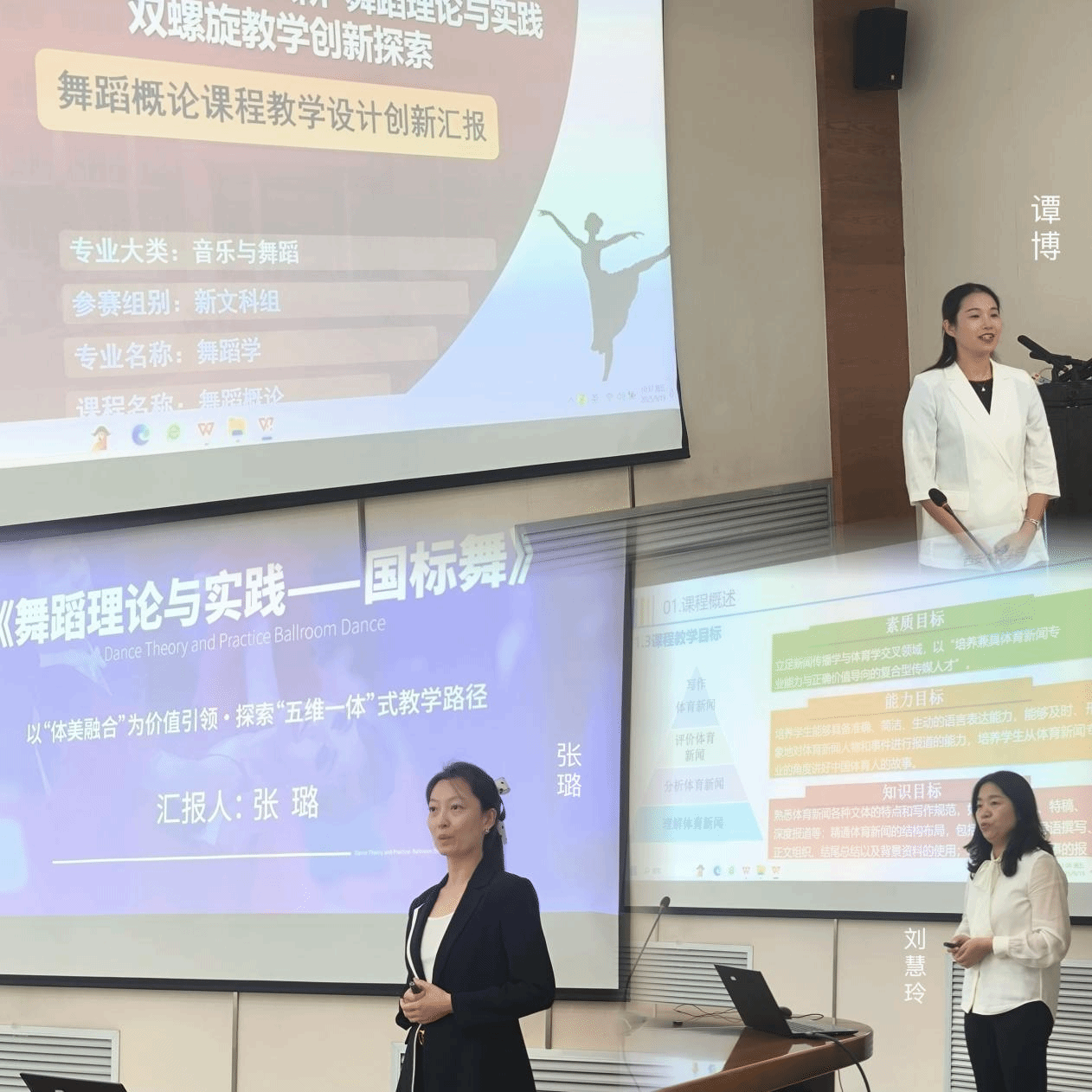 比赛聚焦“教学创新”,旨在通过“以赛促教、以赛促改、以赛促研”不断提升我院教师教学能力,推动课堂教学的高质量发展。各参赛教师结合教学大纲及教学实践,进行了教学设计创新成果汇报;各评委专家从成果汇报、教案撰写、教学创新理念、教学痛点及难点等维度,为参赛教师提供了建设性指导意见。最终,舞蹈教研室谭博老师获院级一等奖,体育舞蹈教研室张璐老师获院级二等奖、新闻教研室刘慧玲老师获院级三等奖。