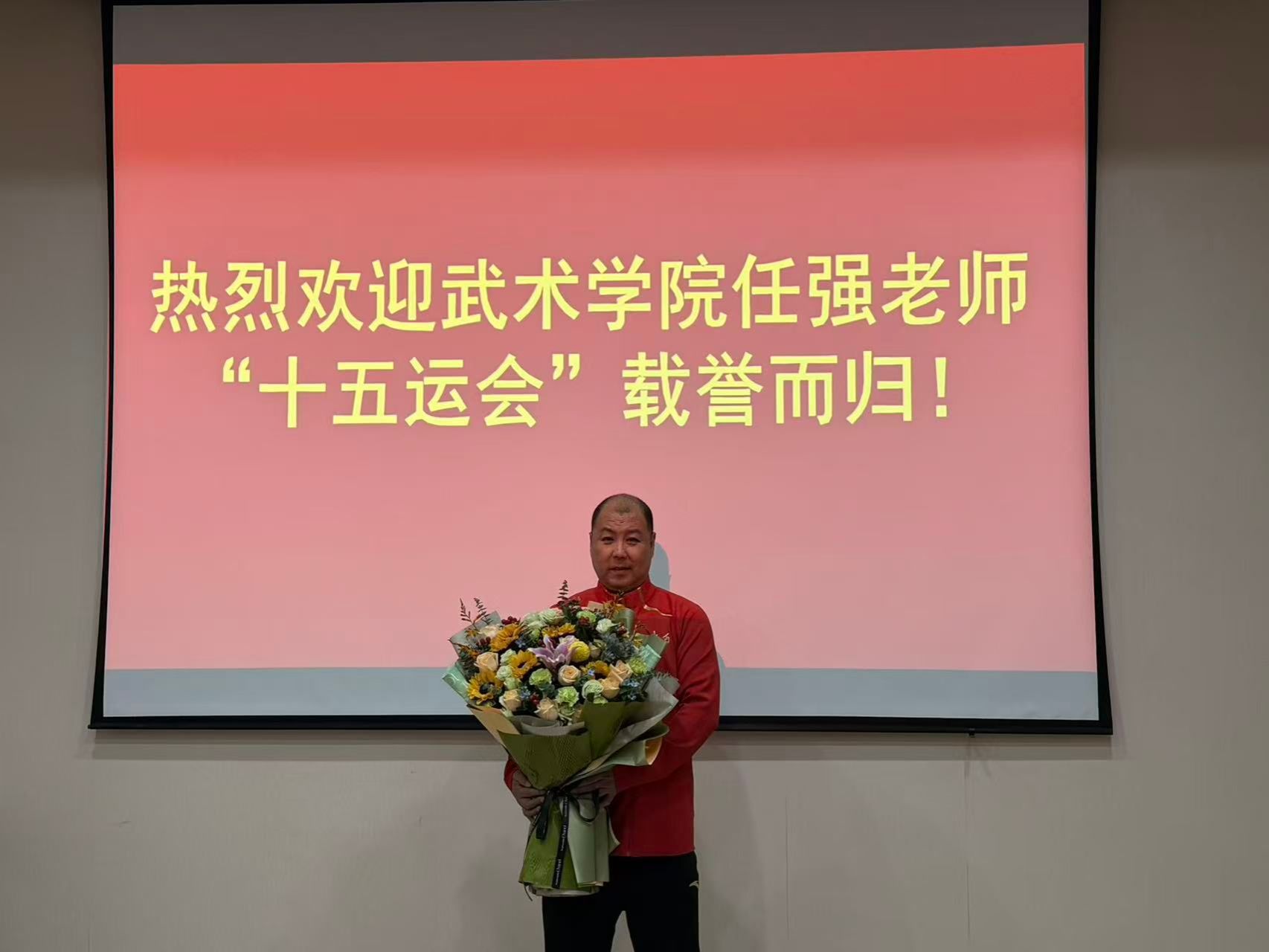 欢迎会上,学院党总支书记刘耀荣在讲话中首先代表武术学院全体师生对任强老师取得的成绩表示祝贺,并号召西体武术人以任强老师为榜样,将拼搏精神融入人才培养、社会服务等各项工作,在学科建设、内涵发展中勇攀高峰。并对学工办相关工作进行部署,要求举办"冠军面对面",邀请任强团队与师生分享成长故事。