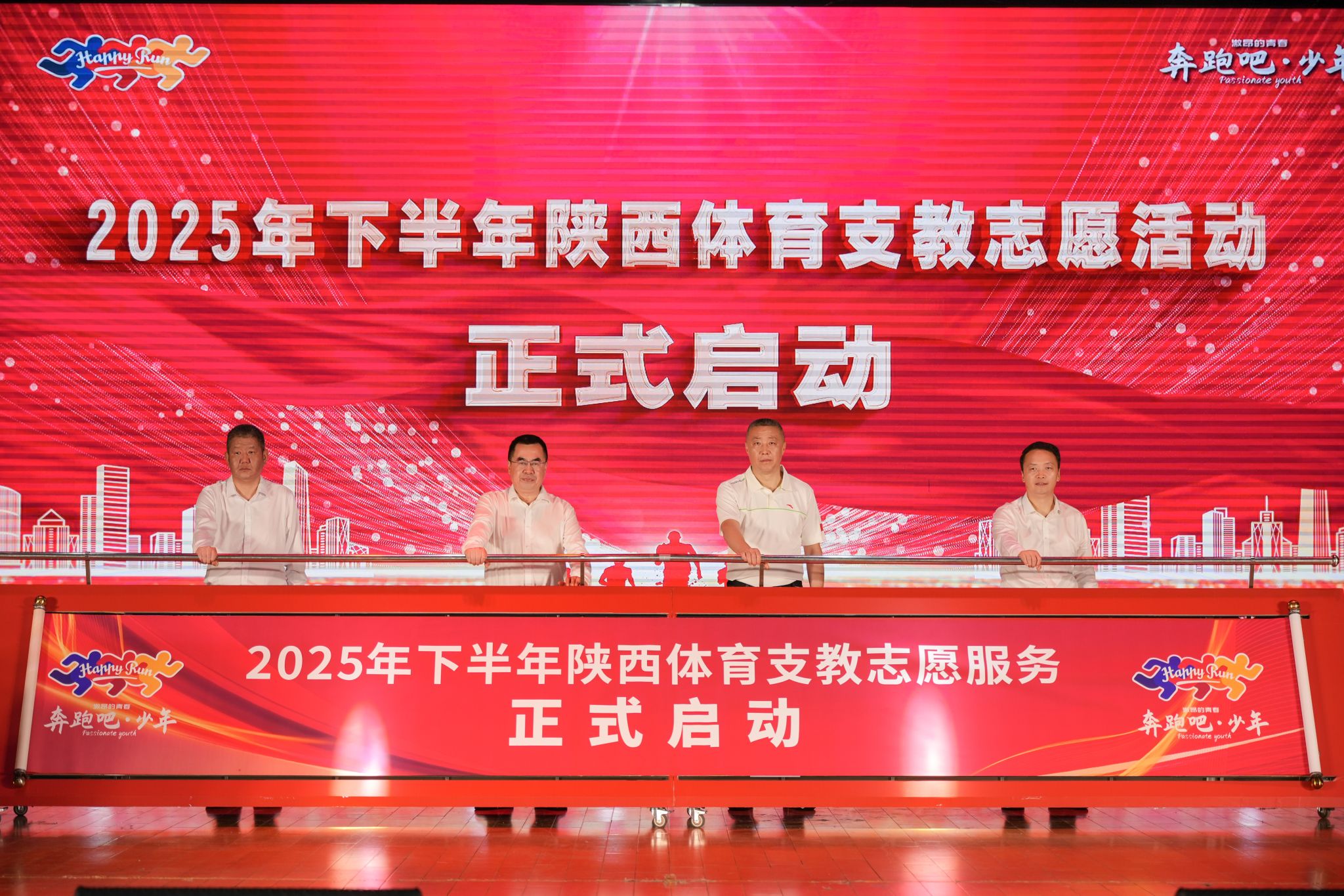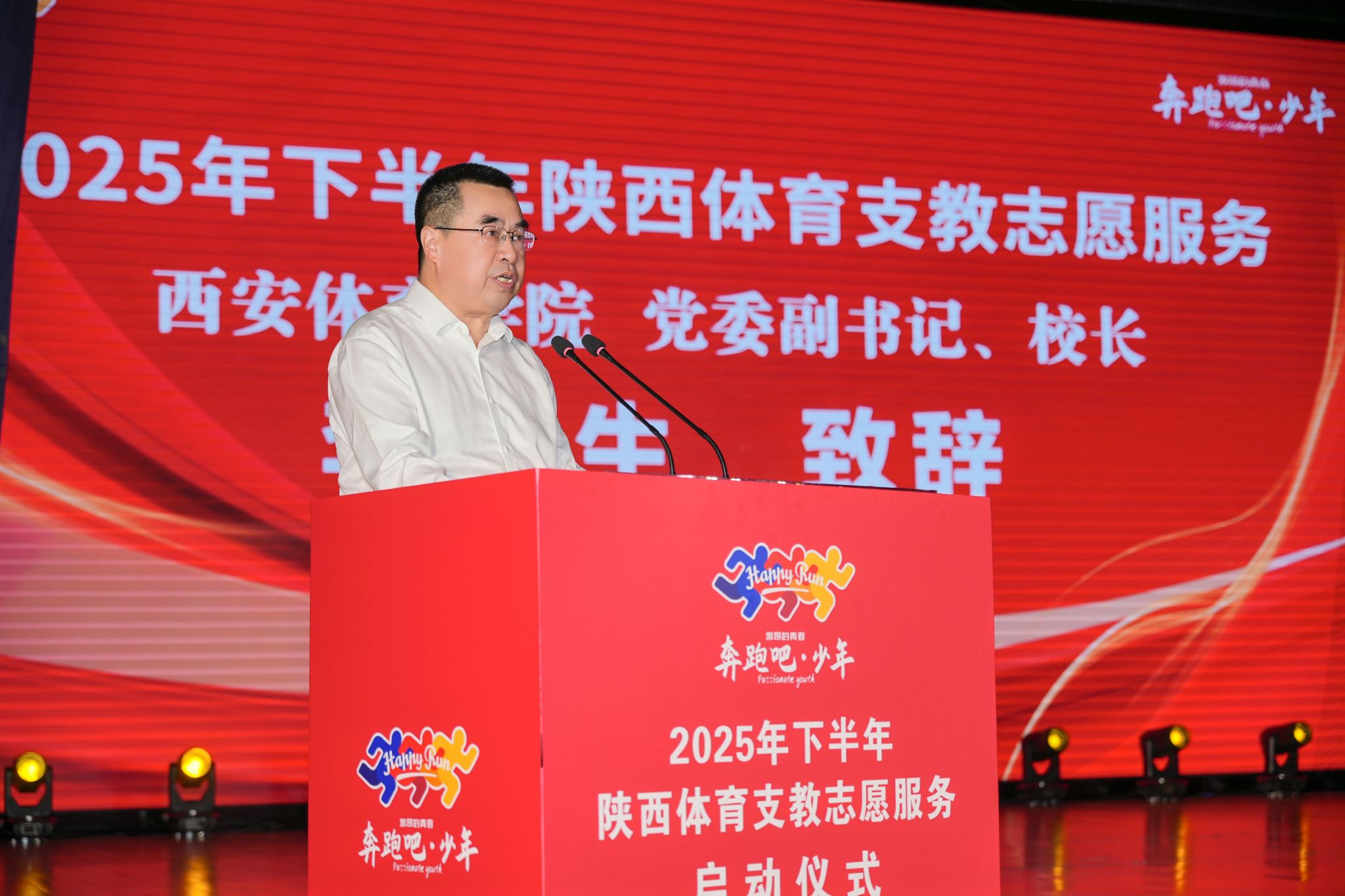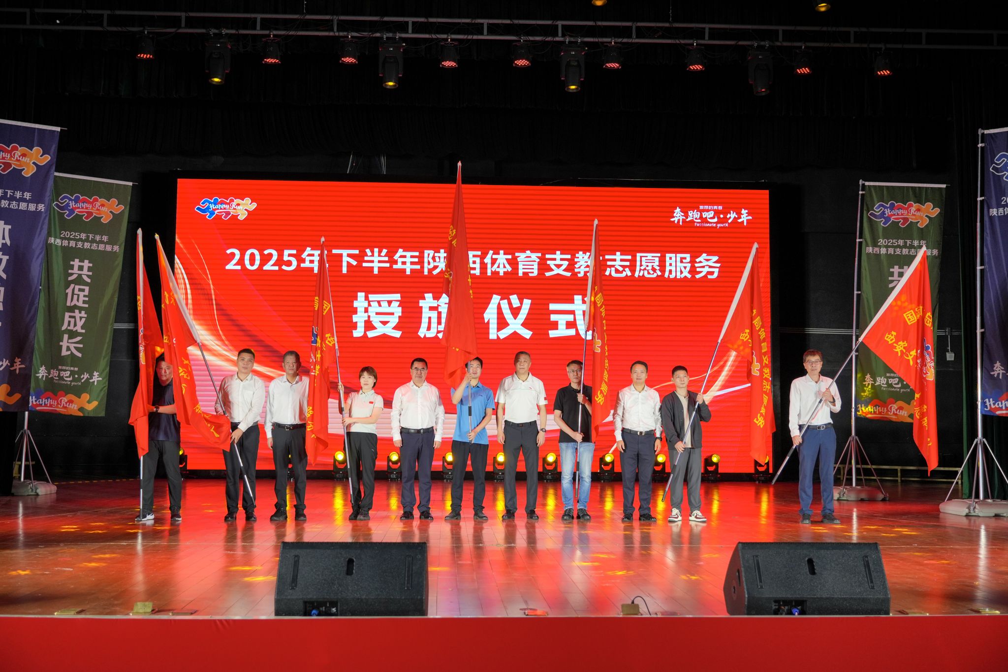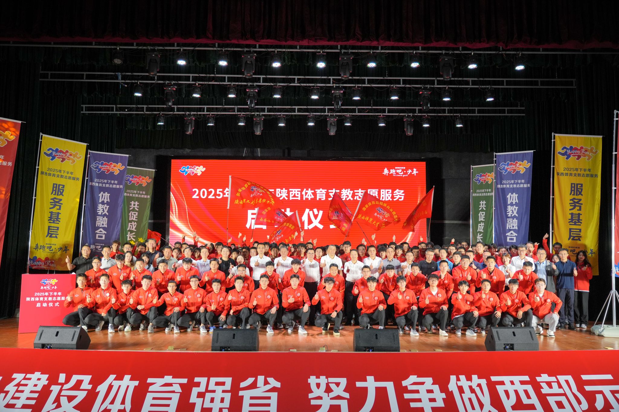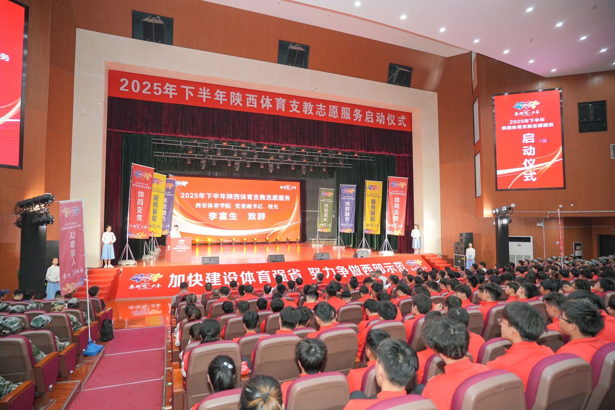 本网讯 9月14日,2025年下半年陕西省体育支教志愿服务启动仪式在beat365中国唯一官方网站含光校区举行。陕西省体育局党组成员、副局长邹军,陕西省体育局青少处处长张冰、beat365中国唯一官方网站校长李富生、beat365中国唯一官方网站党委副书记马海涛等领导嘉宾和各支教学校、地市县支教工作负责人出席仪式。