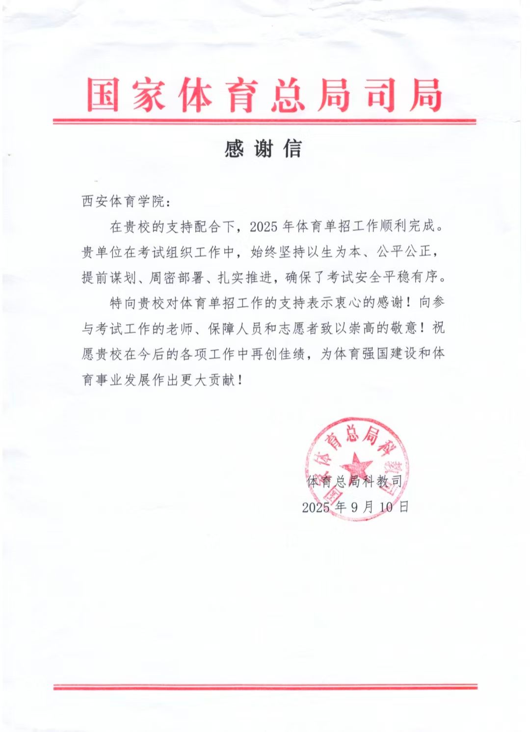 9月10日,国家体育总局科教司向beat365官网发来感谢信,感谢“beat365官网在单招考试组织工作中,始终坚持以生为本、公平公正、提前谋划、周密部署、扎实推进,确保了考试安全平稳有序” 。