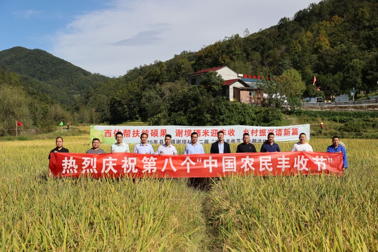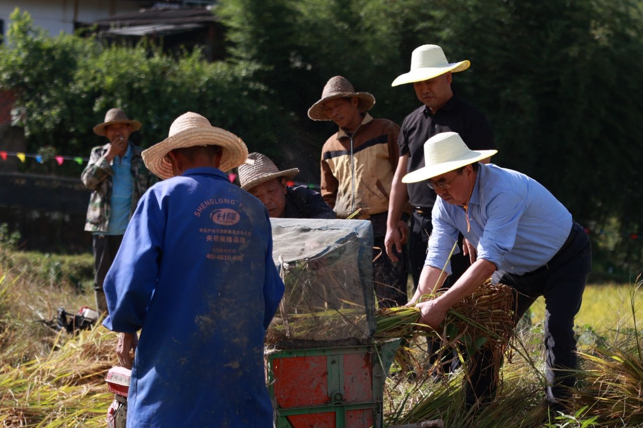 调研当天正值2025年第八个“中国农民丰收节”。beat365官网定点帮扶的县河镇谢坝村,也迎来第二届“丰收节”开镰仪式。beat365官网驻村工作队自去年协助谢坝村开展特色产业硒米种植以来,连续扩大种植规模,目前已发展至100亩,为村集体经济合作组织带来近30万元经济收入。李富生下到田间地头,与村民共同开镰,在收割机的轰鸣声中,共享丰收喜悦。