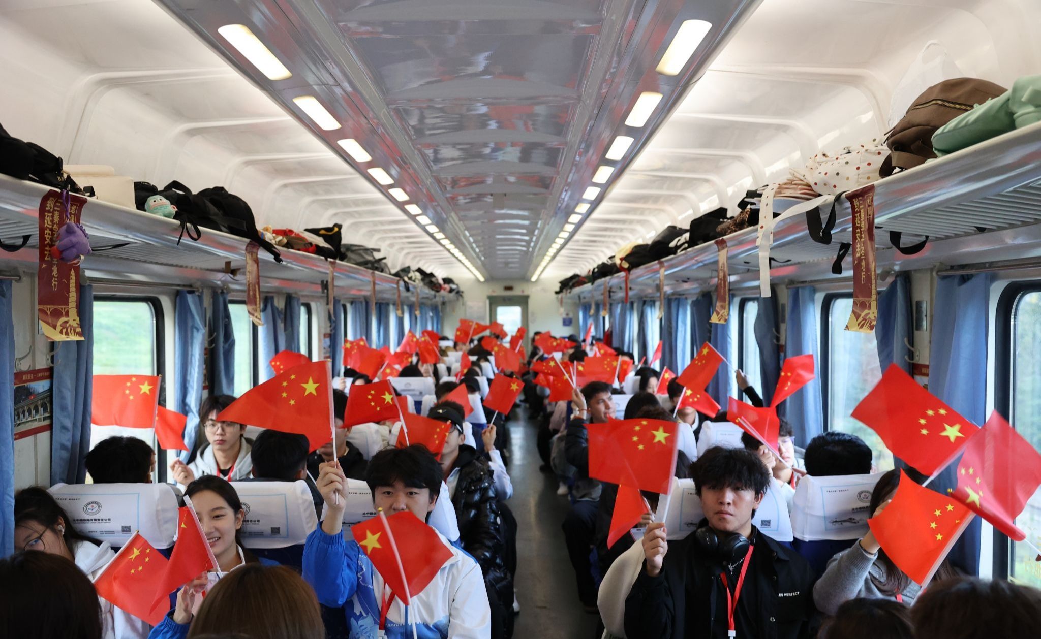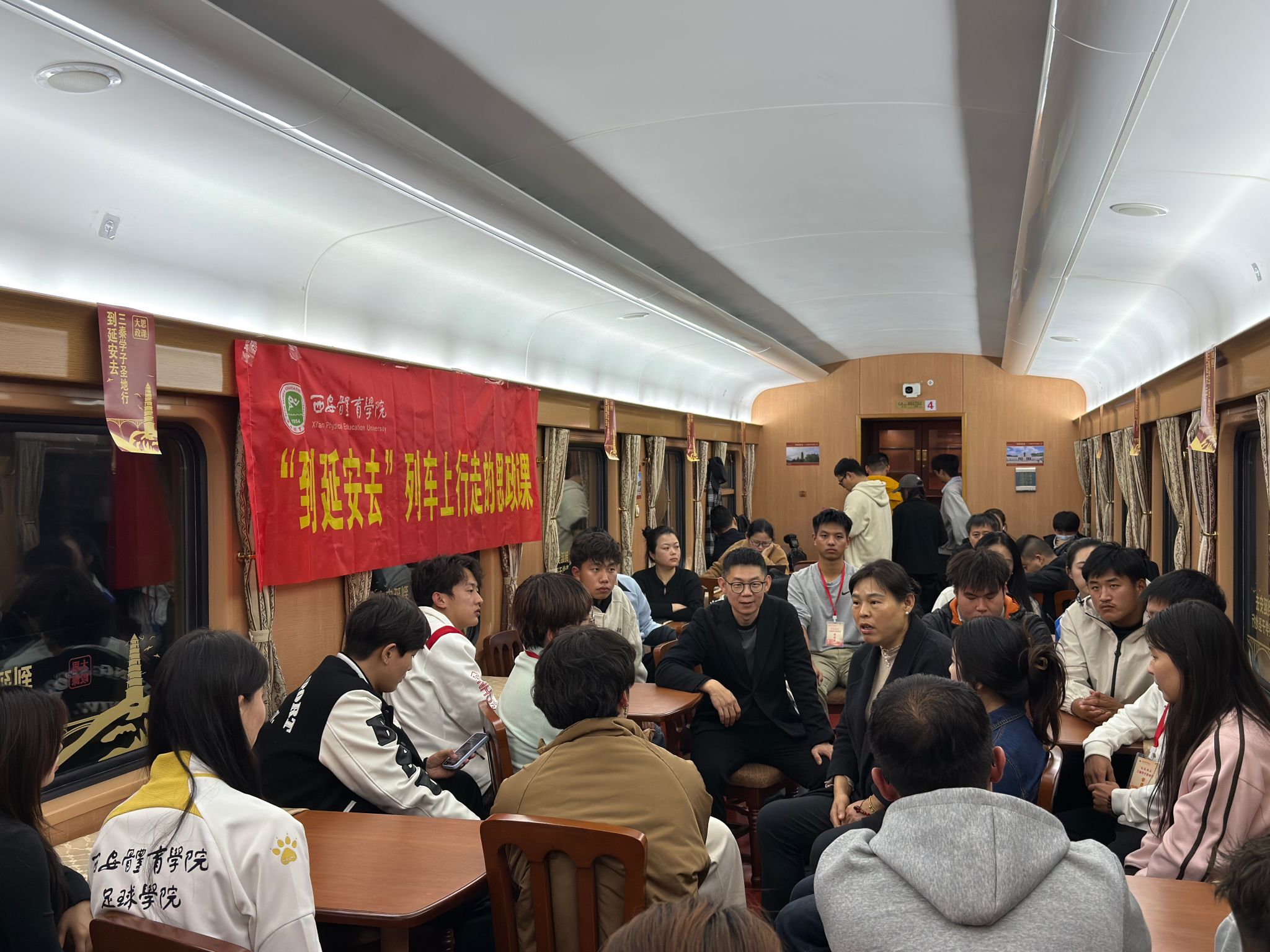 11月1日上午7时,载着对革命圣地的无限向往,实践团的列车缓缓驶出西安。为使学子们在列车途中也能收获满满,学校精心策划了“到延安去”列车上行走的思政课、革命歌曲联唱、诵读经典红色篇章、红色知识问答等活动。