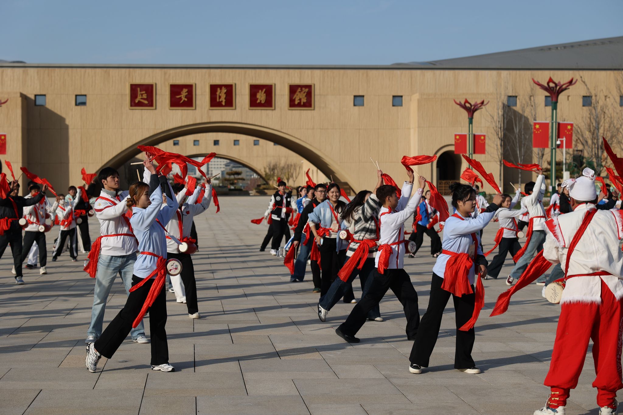 在非遗传承中坚定文化自信,在动静结合中感受红色文化的活力,实践团还组织了安塞腰鼓非遗体验活动。在专业老师的指导下,师生们背起腰鼓,手握鼓槌,跟着铿锵的节奏舞动。在激昂的鼓点与矫健的舞步中,不仅亲身体验了陕北民间艺术的独特魅力,更从这种充满力量与热情的表演中,感受到了老区人民昂扬向上的精神风貌。