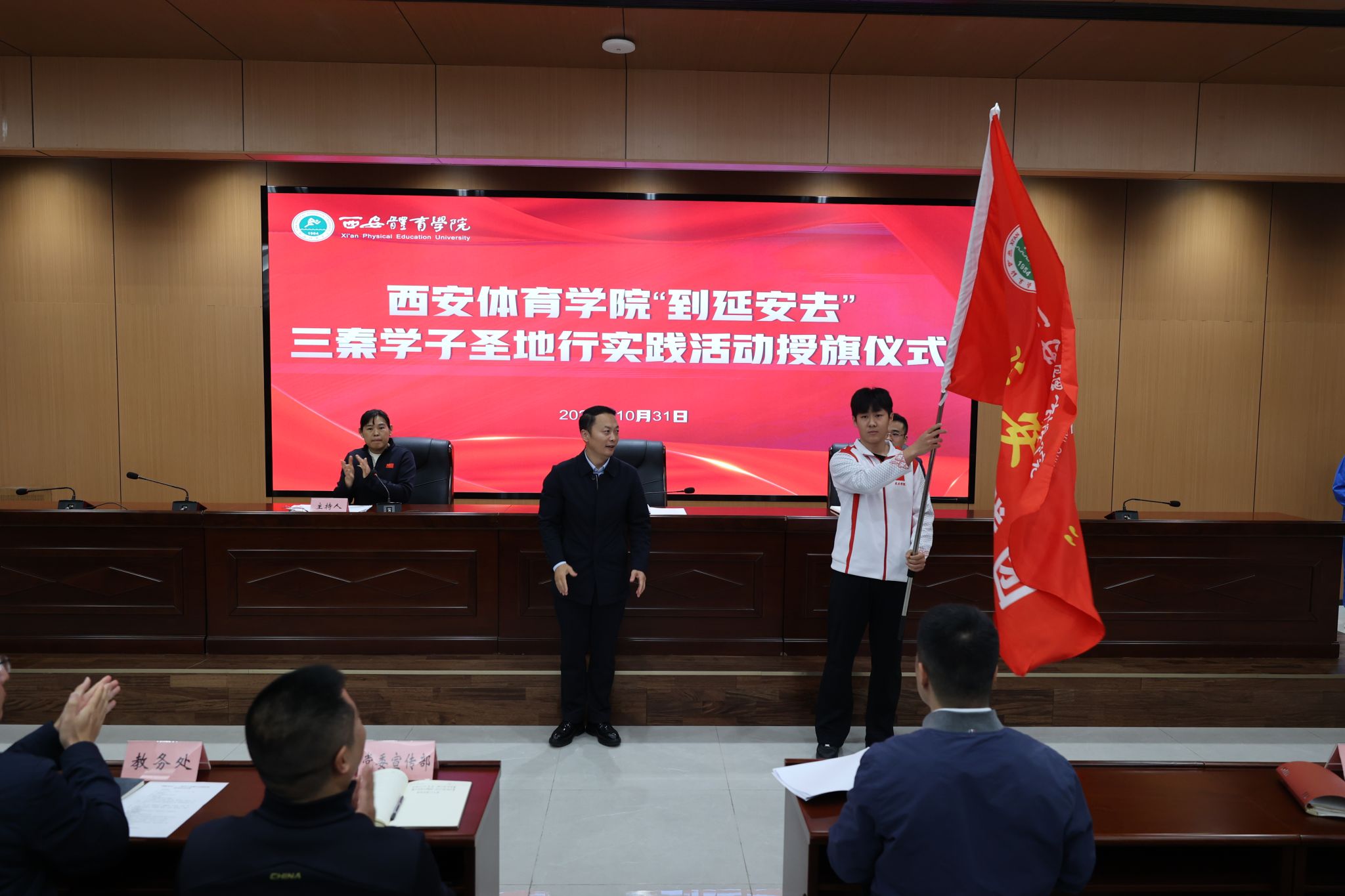 10月31日,“到延安去”・三秦学子圣地行实践活动出征仪式在鄠邑校区行政楼541举行,校党委副书记马海涛副出席出征仪式,马书记就何为延安精神为同学们做了深度解读,强调了“到延安去”实践活动的重要性,分享了感悟,并对做好beat365官网到延安去实践活动提了三点要求:一是深刻理解为什么到延安去;二是到延安去给学生能带来什么;三是延安行要做到三个实处,即“带着思考去,带着敬畏去看,带着责任去做。”他对同学们寄予了殷切期望,鼓励大家在活动中汲取奋进力量,并为实践团授旗。学工部部长马国华宣读《beat365中国唯一官方网站关于开展“到延安去”·三秦学子圣地行活动的工作方案》;马克思主义学院教师孙赵璇,体育教育训练学院研究生努尔比耶·吾拉依木分别作为教师代表、学生代表发言。参与师生怀着激动的心情,正式开启延安红色实践之旅。