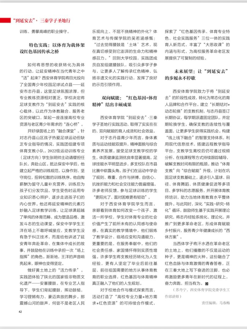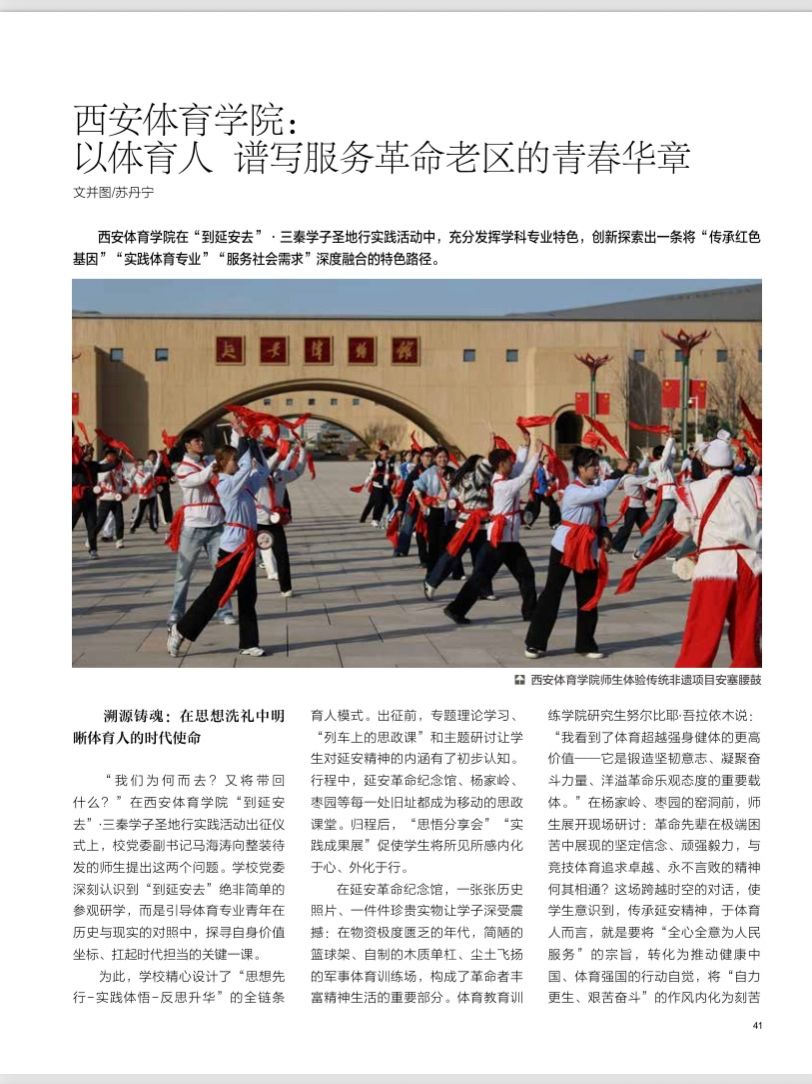 此次成果刊发,既是对beat365中国唯一官方网站“以体育人”特色育人创新探索的充分肯定,也为高校服务革命老区发展、开展“大思政课”建设提供了可复制的“西体经验”。未来,学校继续将红色育人全方位融入人才培养全过程,让红色基因与体育精神在新时代同频共振,推动“到延安去”从阶段性实践转化为常态化育人品牌,书写新时代体育人助力乡村振兴、服务青少年健康成长的奋进篇章。
