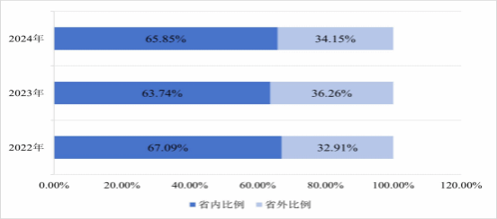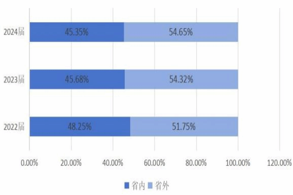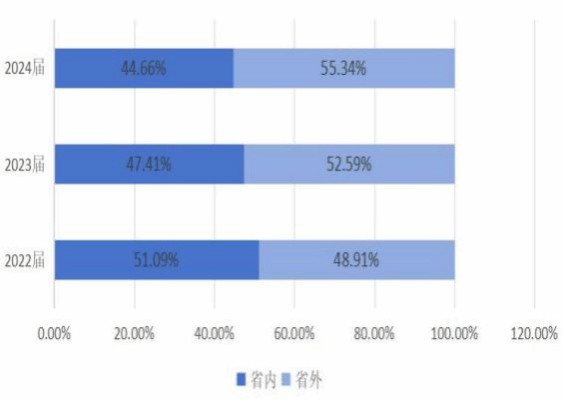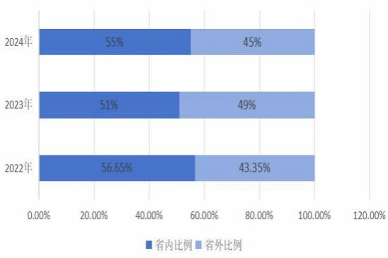 业。2022年省外就业比例为43.35%,2023年上升至49%,2024年又降至45%。呈现先上升后下降的趋势,与省内就业比例的变化趋势相反。