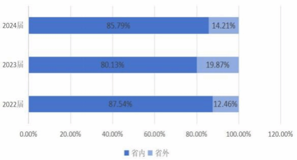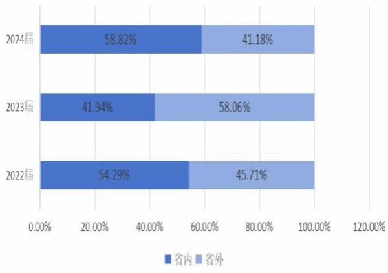 整体来看,省内和省外就业比例差距在缩小。2022年两者相差13.3% ,2023年相差2% ,2024年相差10% 。这反映出毕业生就业地域选择更加多元化。