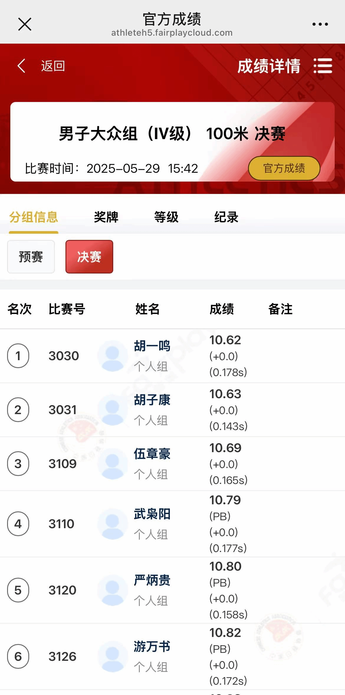 比赛当天,随着发令枪响,胡一鸣如同脱缰野马,瞬间爆发出惊人的速度,以出色的起跑反应和稳健的途中跑技术迅速抢占领先位置。在紧张的比赛中,他始终保持冷静,步伐稳健,节奏感十足。进入最后的冲刺阶段,胡一鸣更是展现出了令人惊叹的爆发力,最终,他以10秒62的优异成绩率先撞线,以0.01秒的微弱优势力压第二名,强势夺得本次比赛的冠军。更