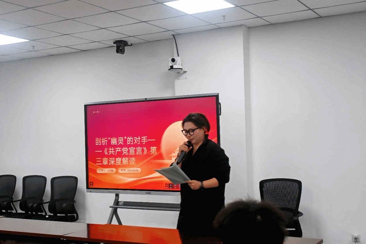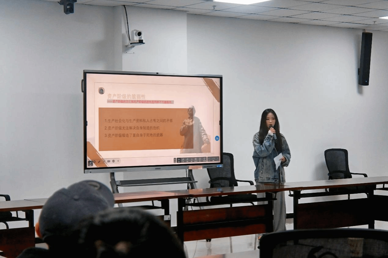 第四位王郅敏同学针对《社会主义的和共产主义的文献》这一内容,梳理并批判了当时流行的各种伪社会主义思潮。她以史为鉴,联系现实,强调了在思想领域保持清醒、辨别真伪、坚持科学社会主义原则的极端重要性,引发了在场同学对如何在纷繁复杂的信息时代坚守马克思主义阵地、抵制错误思潮的深入思考。
