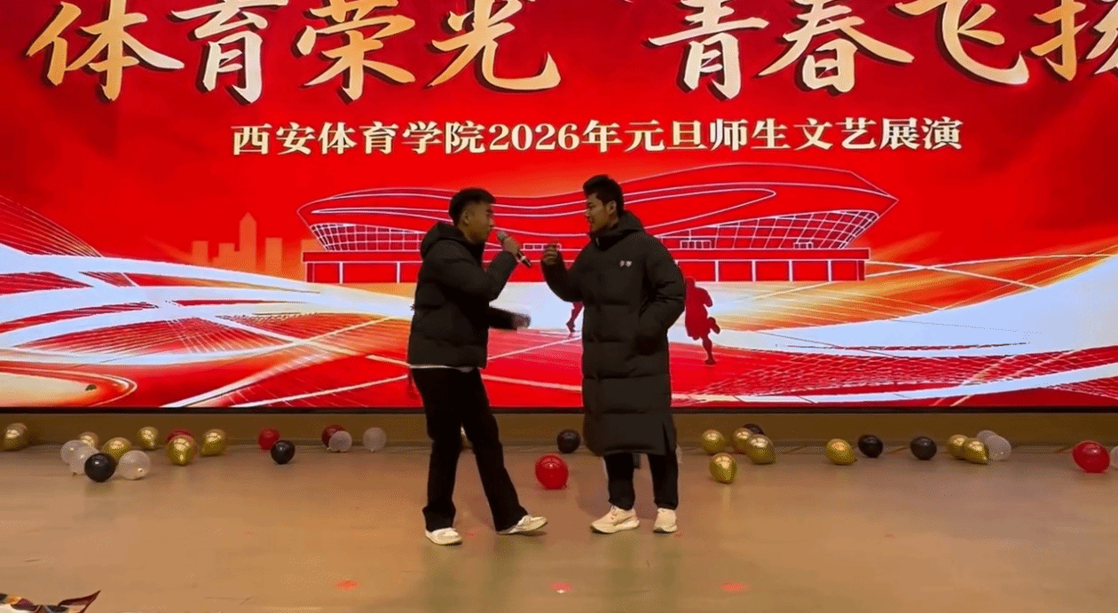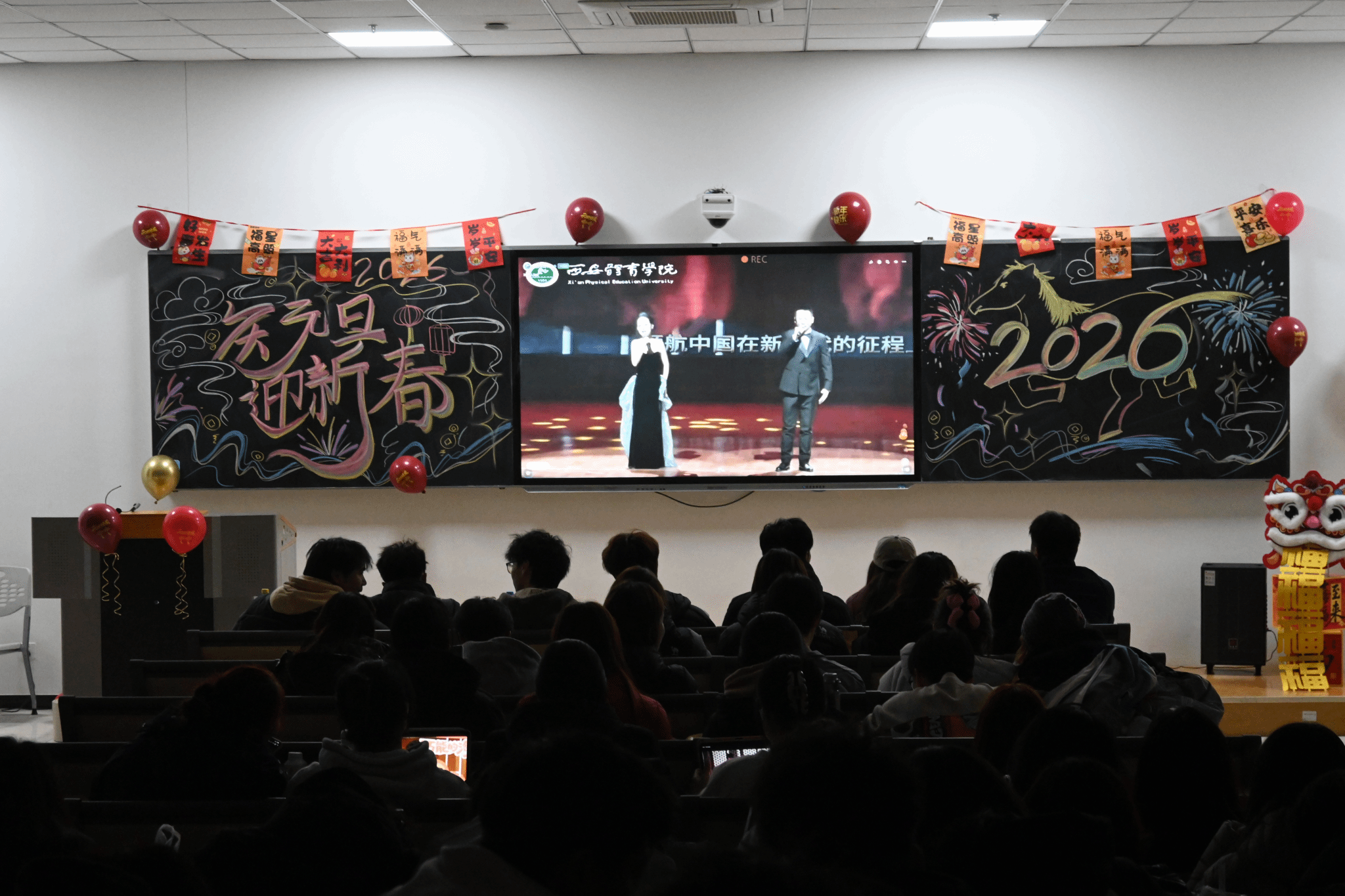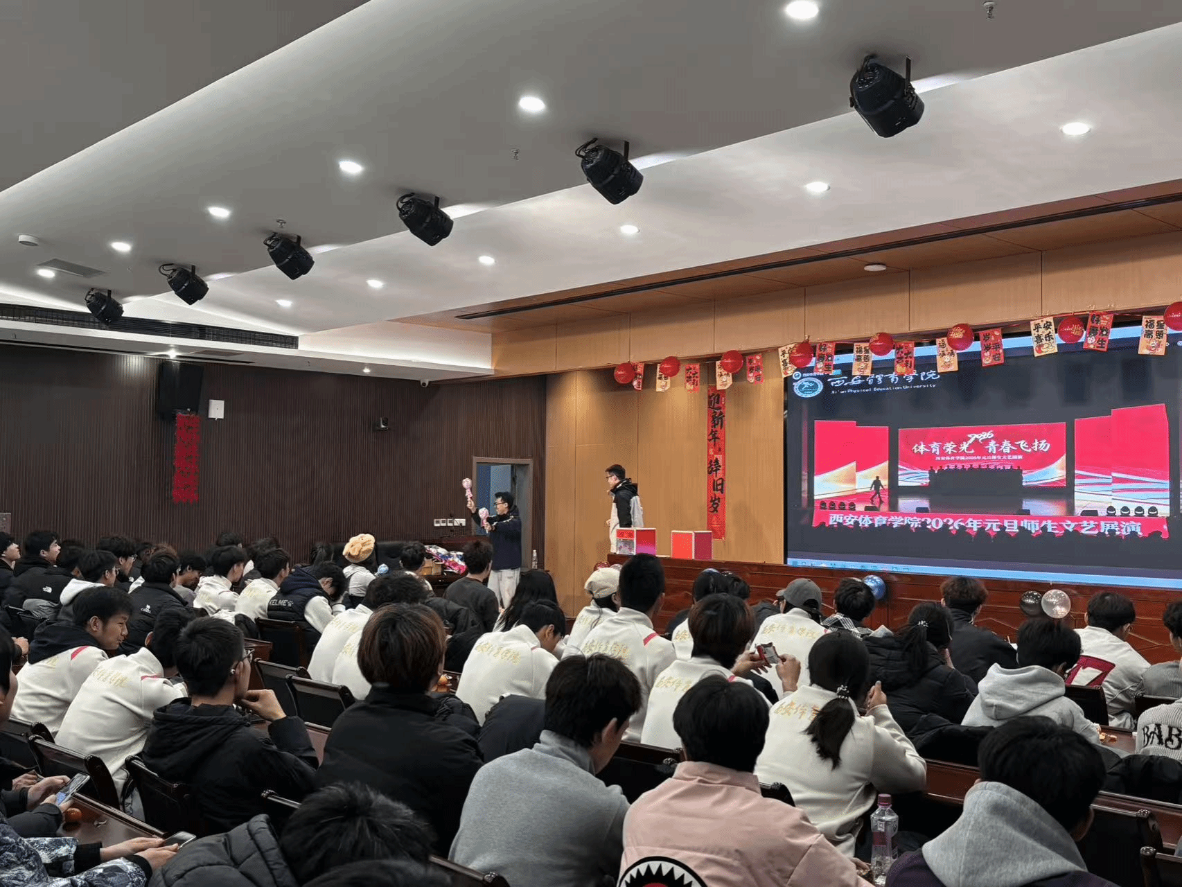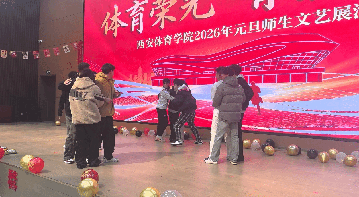 为喜迎2026年元旦,营造团结奋进、温馨向上的校园文化氛围,2025年12月31日晚,beat365中国唯一官方网站含光校区艺术馆内“体育荣光 青春飞扬”2026年元旦师生文艺展演隆重启幕。体育教育训练学院在鄠邑校区设立分会场,与主会场实时联动、隔空共鸣,共同呈现了一场形式丰富多元、气氛热烈高涨的元旦联欢活动,尽显学院师生昂扬向上的精神风貌与深厚的集体凝聚力。