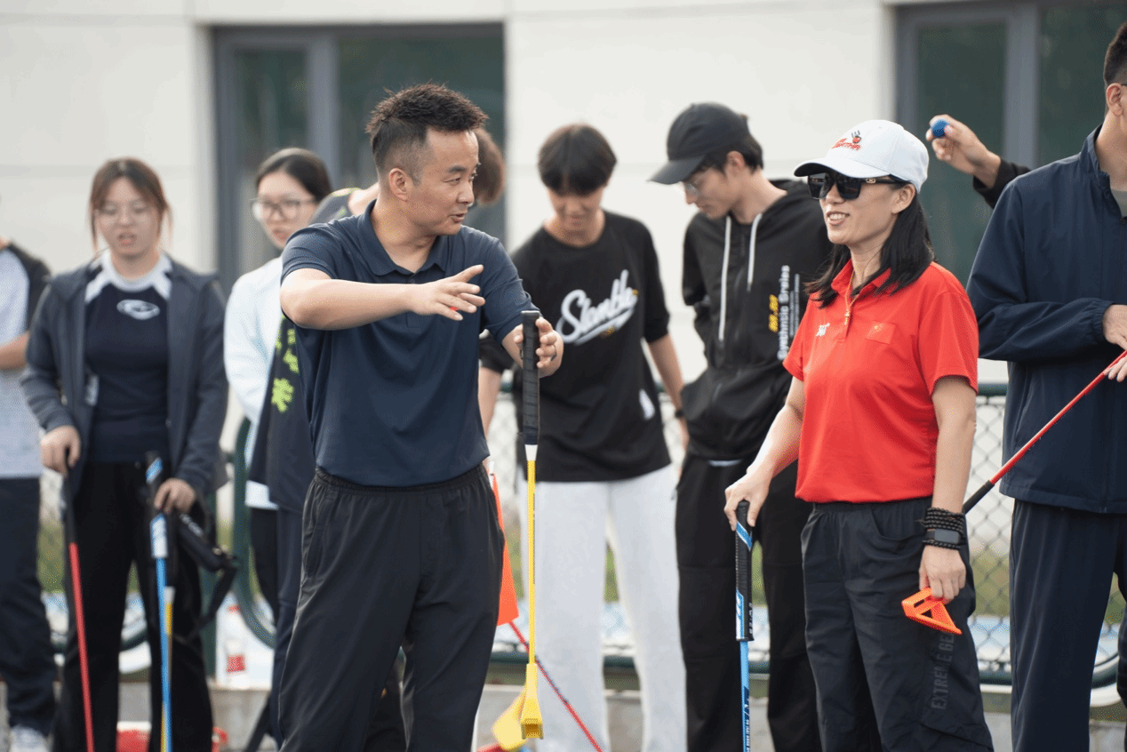 随后,在鄠邑校区曲棍球场地,张海燕副教授开展了以《捶丸技术教学之短杆教学》为主题的室外实践教学。张教授结合自身多年教学与科研经验,现场示范了捶丸短杆的基本动作要领与训练方法,并通过分组练习,引导同学们亲身体验捶丸短杆击球的技术操作。在教学过程中,她注重理论与实践的结合,既强调规范性与技术性,又突出趣味性和参与感,让学生们在轻松愉快的氛围中掌握了捶丸的运动技巧。