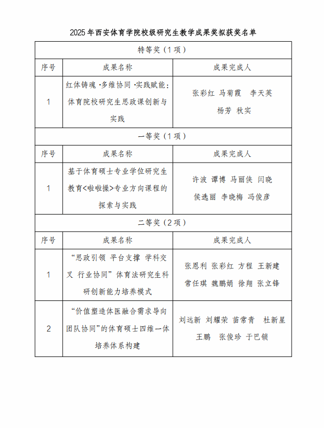 beat365中国唯一官方网站2025年校级研究生教育教学成果奖评审工作已 于近日完成,经项目负责人申报,各学院推荐,校外专家评审, 拟授奖成果 4 项,其中特等奖 1 项,一等奖 1 项,二等奖 2 项, 现予以公示。