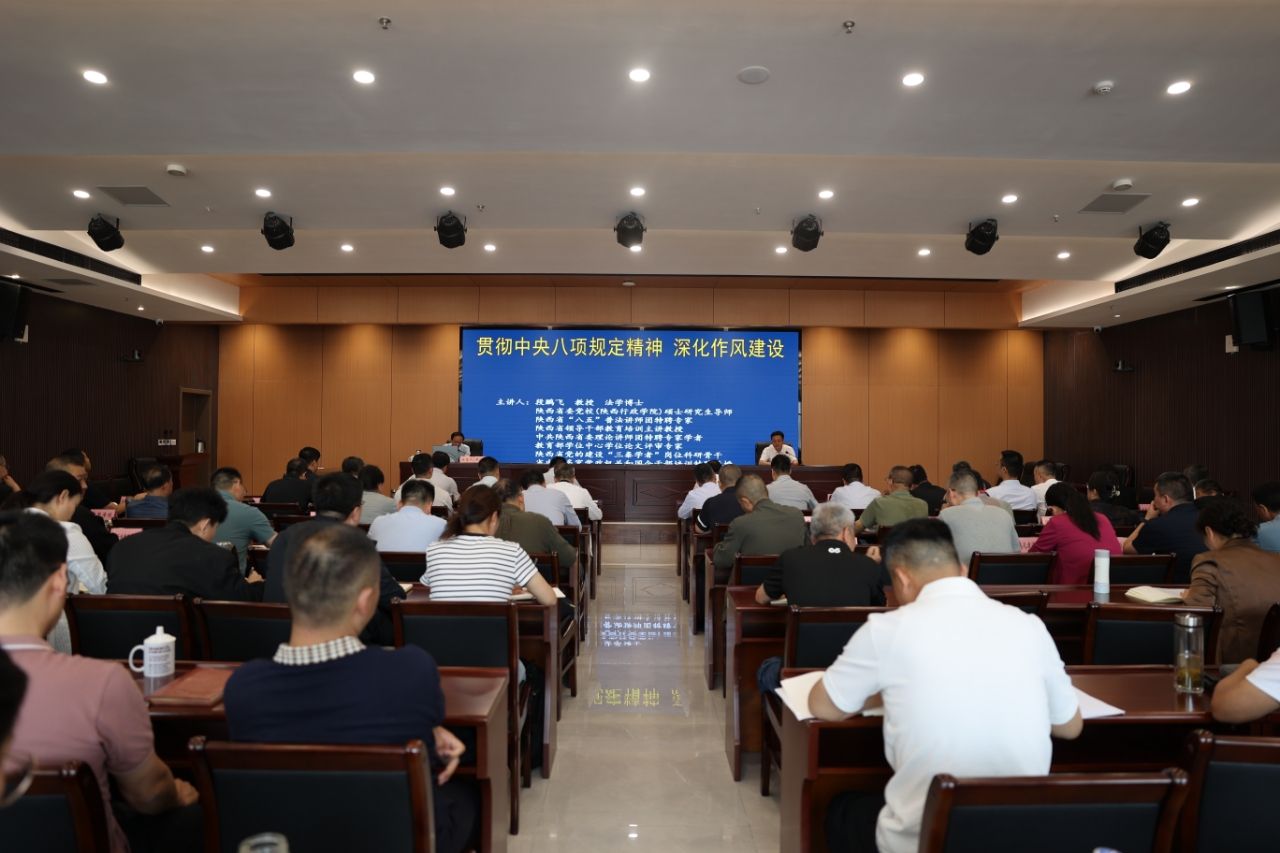 5月8日,beat365官网召开深入贯彻中央八项规定精神学习教育专题辅导报告,邀请中共陕西省委党校(陕西行政学院)党建教研部段鹏飞教授做了题为《贯彻中央八项规定精神 深化作风建设》的辅导报告。校领导、副处级以上干部参加学习,党委副书记张卫国主持报告会。
